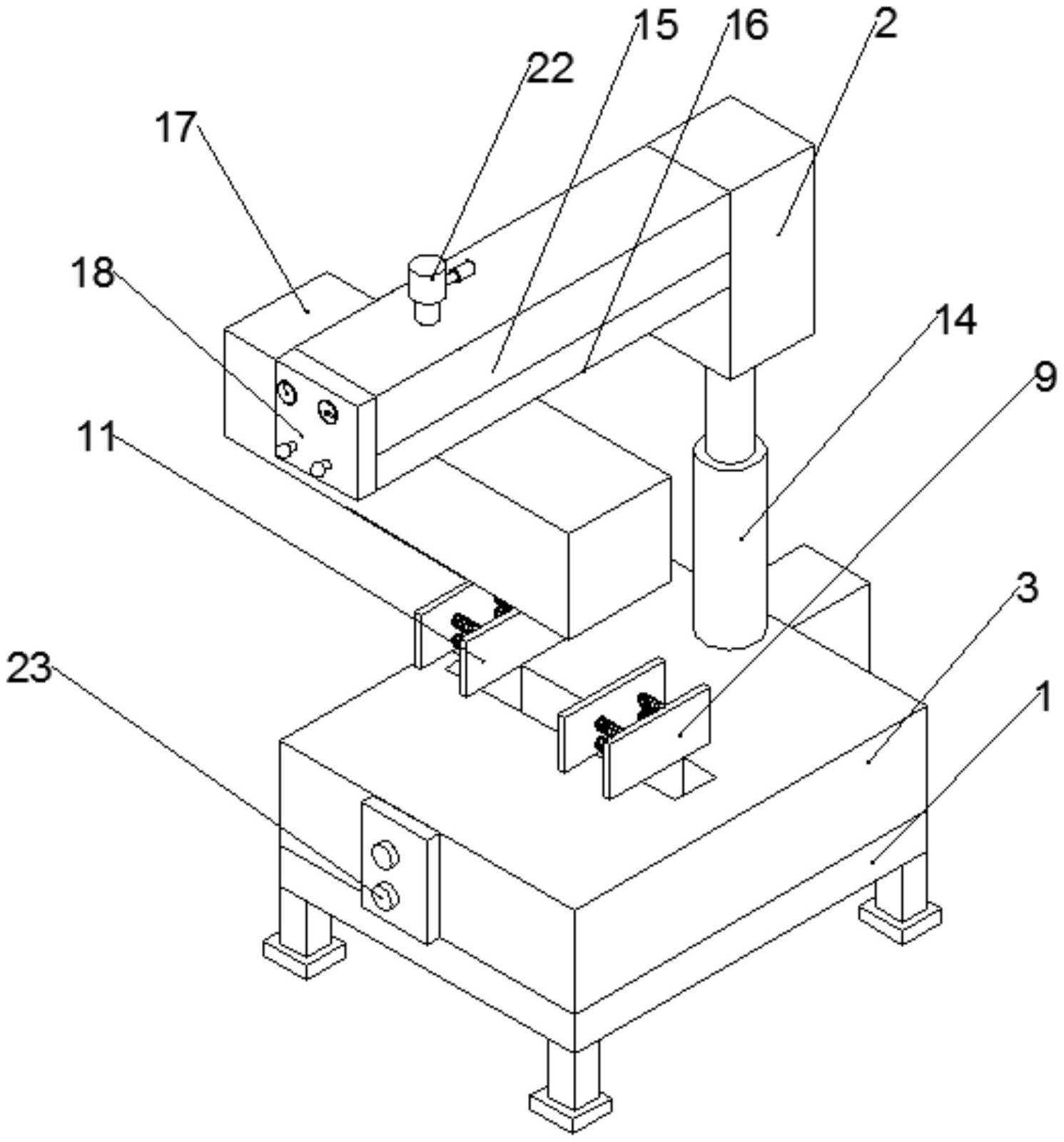 本实用新型公开了一种超声波塑焊机,包括底板和装置本体,底板的上表壁固定连接有底座,底座的左侧壁固定连接有电机,电机的输出轴穿入底座的内腔并固定连接有双向螺纹杆,双向螺纹杆的两端均通过轴承与底座的内部左右两侧壁转动连接,双向螺纹杆的两端外壁均螺纹连接有螺纹套,两个螺纹套的上表壁固定连接有固定杆,两个固定杆远离螺纹套的一端均固定连接有支撑板,两个支撑板的相对一侧均固定连接有对称分布的限位伸缩杆,相同一侧两个限位限位伸缩杆远离支撑板的一端均共同固定连接有夹板,多个限位伸缩杆的外壁均套设有缓冲弹簧,该种超声波塑焊机,在对待焊接件的固定和焊嘴高度调节方面,具有较好的效果。