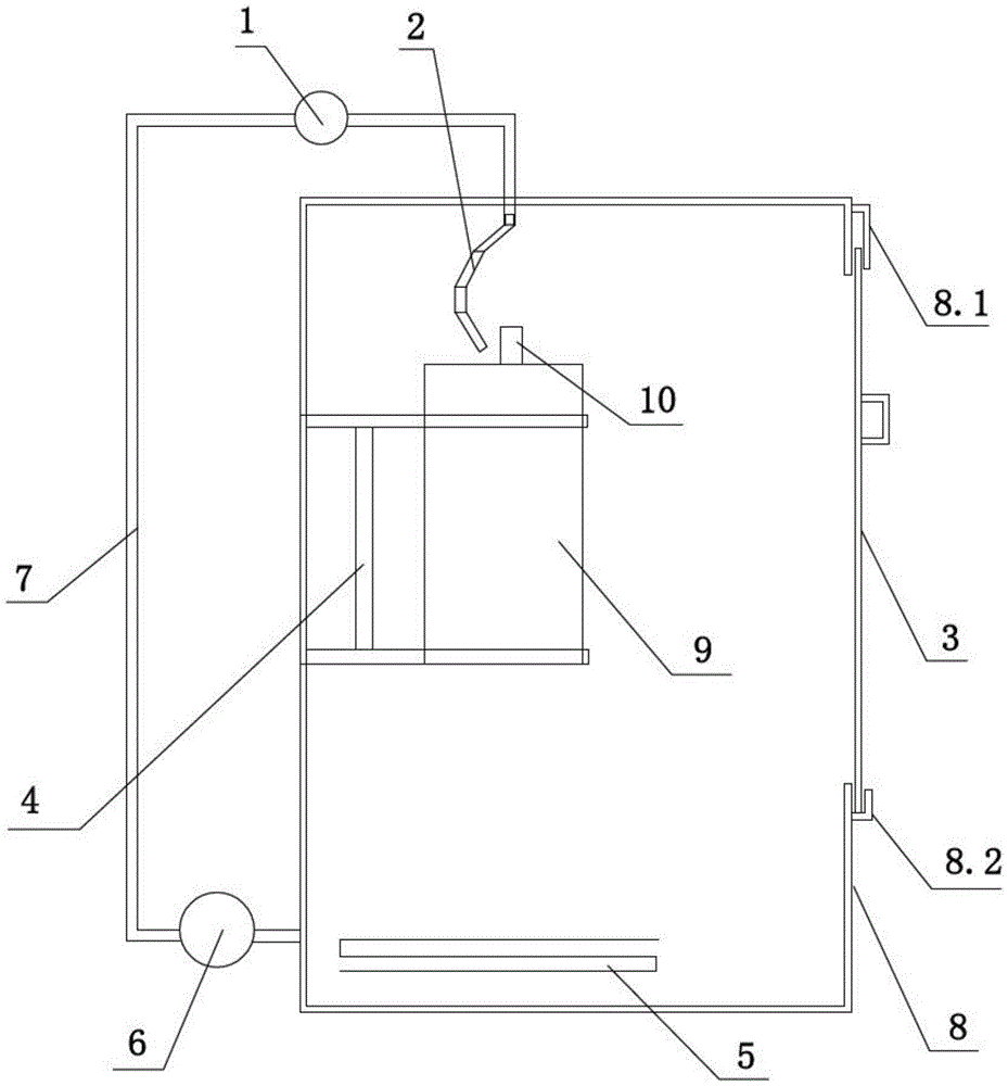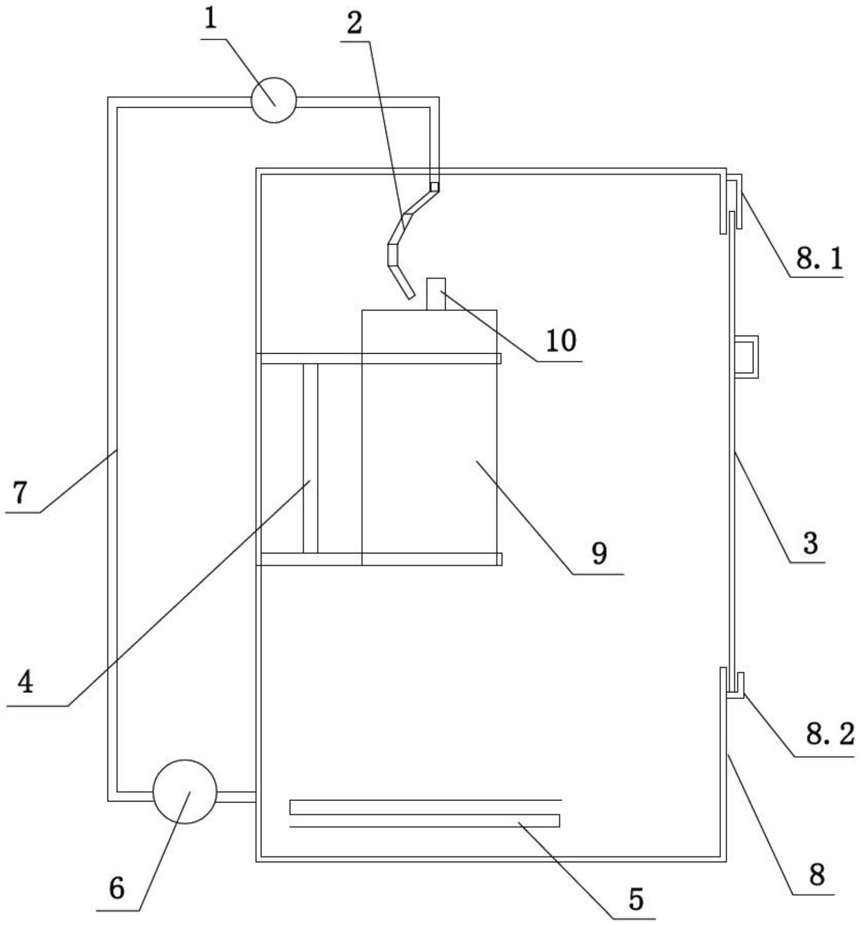 本实用新型公开了一种电机防水性能检测装置,属于检测装置技术领域。包括底部盛装循环水的密封箱体,所述密封箱体底部设有加热器,密封箱体外接循环水管路,所述循环水管路上设有循环水泵和流量计,循环水管路出水口连接位于密封箱体内的万向喷嘴,所述万向喷嘴位于支撑架上方,所述密封箱体上设有可开启的密封门。本实用新型的有益效果是:对电机的防水性能进行检查,避免电机防水性能不合格导致在潮湿环境下使用引起电机故障,保证系统正常运行,避免资源浪费。
