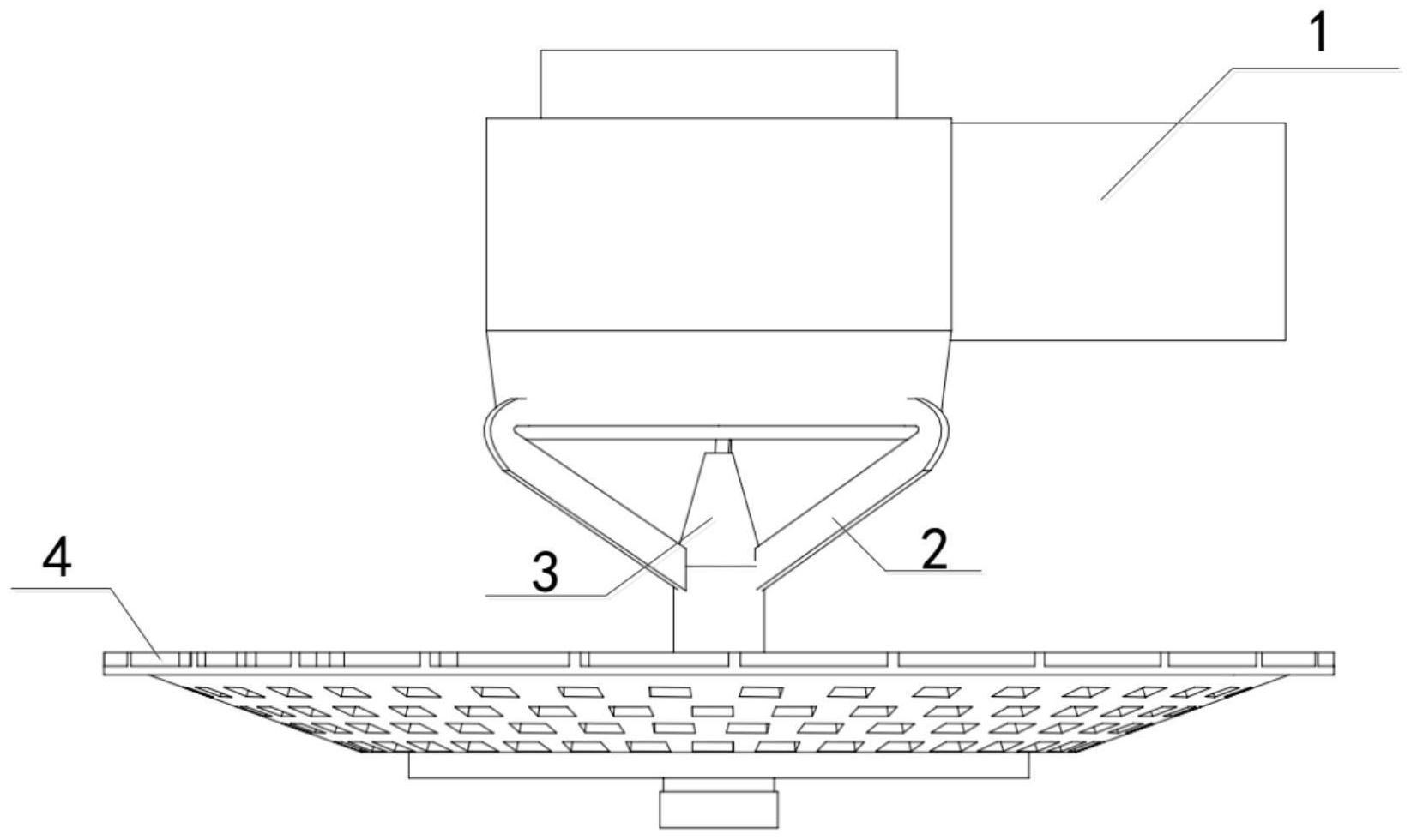 本发明公开了一种离心式旋流空心可旋转喷嘴装置,属于空调制冷技术领域。该装置包括离心式旋流空心喷嘴、连接杆、固定轴和锥形配水盘。所述锥形配水盘通过中心圆环安装在固定轴的安装槽内,中心圆环与安装槽为间隙配合,锥形配水盘可以自由转动。当冷却水经离心式旋流空心喷嘴的作用后,一部分冷却水与锥形配水盘上方的斜挡板发生碰撞从而产生推力,使锥形配水盘绕着固定轴旋转;同时另一部分冷却水与旋转的锥形配水盘的锥形立面发生碰撞后,从配水孔逐次分配流下,覆盖喷嘴下方位置;本发明可以有效改善单侧切向入口离心式旋流空心喷嘴布水靠近入口一侧水量较多这一特点,在喷淋范围内布水更加均匀。