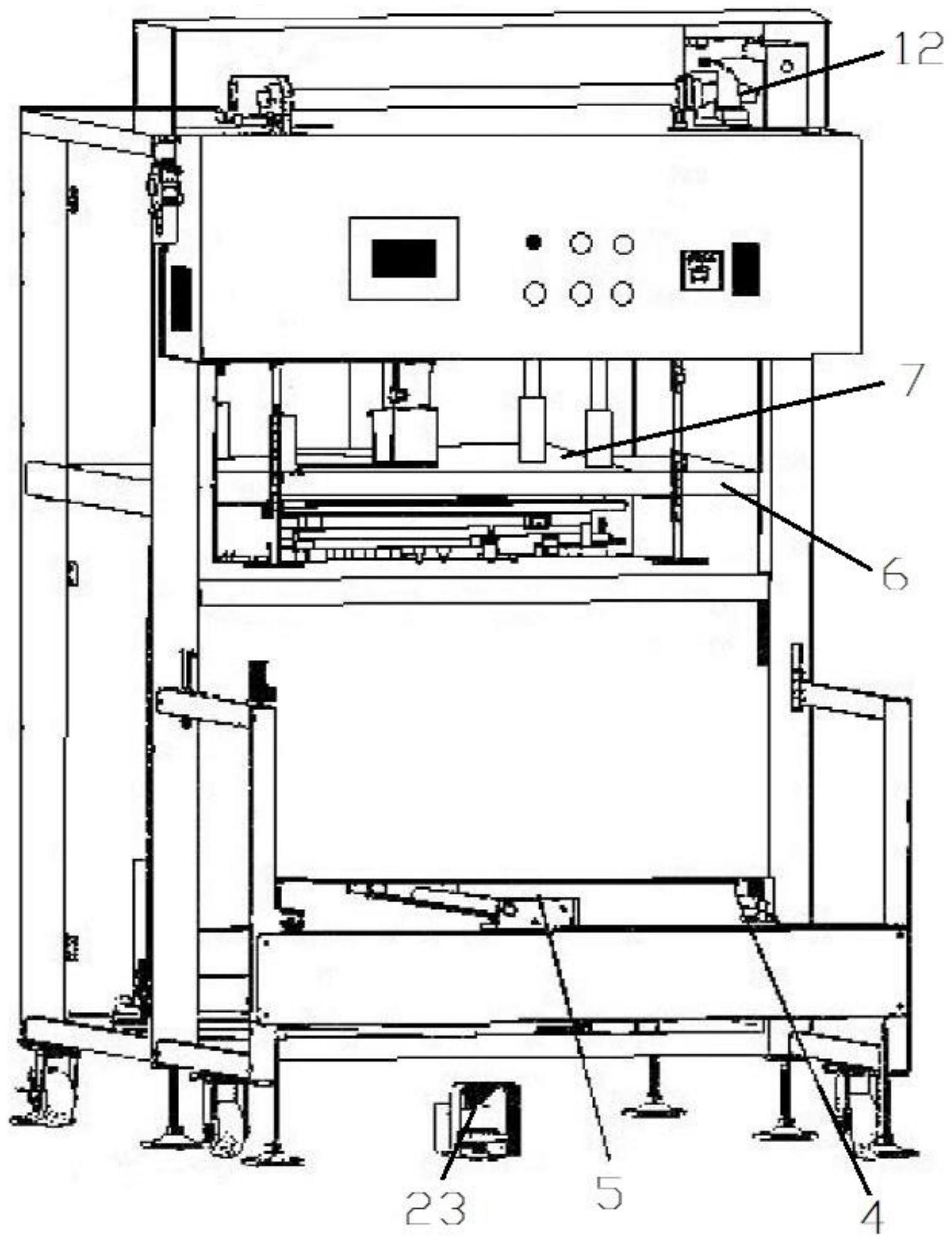 本发明公开了一种PVC冷却塔填料自动热焊机,属于热焊装置技术领域。架体底部设有升降托板,升降托板连接升降驱动机构a,所述升降托板上滑动连接放料平台,架体两侧平行设置横梁,横梁上设有安装板,升降驱动机构b位于所述安装板上,所述升降驱动机构b连接压焊板,压焊板底部滑动连接焊接横移机构,焊接横移机构底部连接焊接机构,所述升降驱动机构a、升降驱动机构b以及焊接横移机构均与PLC连接。本发明的有益效果是:代替人工焊接操作,增加产能,降低人工劳动强度,提高自动化程度,节省人力成本,使热焊工作更安全。