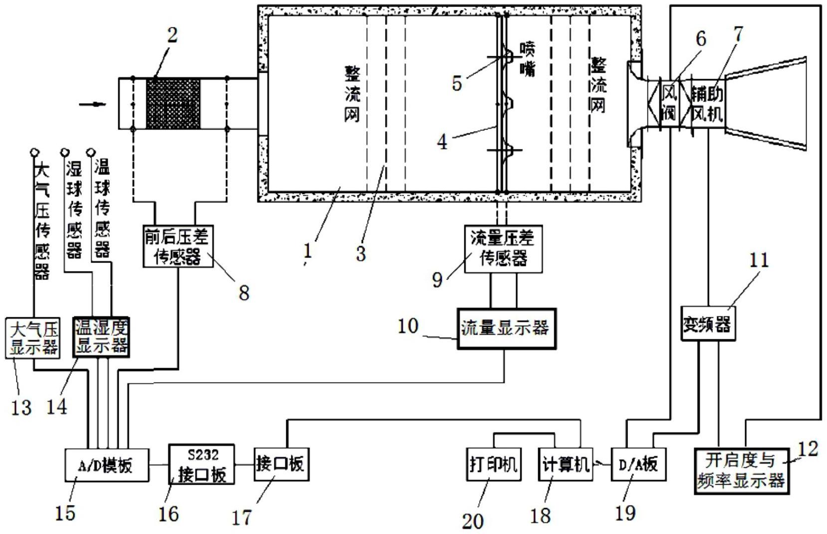 本实用新型公开一种冷却塔收水器阻力测试装置,包括风室,其前端入口安装待测收水器,风室前部设整流网,整流网后面适当距离处设隔板,隔板有若干喷嘴,隔板后面再设整流网,风室后端与风道连接,风道中安装有风阀和辅助风机;辅助风机由变频器控制驱动;在收水器相关部位安装多种传感器,各传感器与A/D模板连接,A/D模板通过接口板与计算机连;计算机通过D/A模板连接变频器及风阀。测试采集收水器不同风速时的大气压、湿球温度、静压、风量、收水器前后压差。将模拟量转化成数字信号送入计算机处理,然后拟合风速v和压力P曲线,找出拟合公式P=a*v2+b*v,即是本收水器在不同风速下的阻力计算公式。