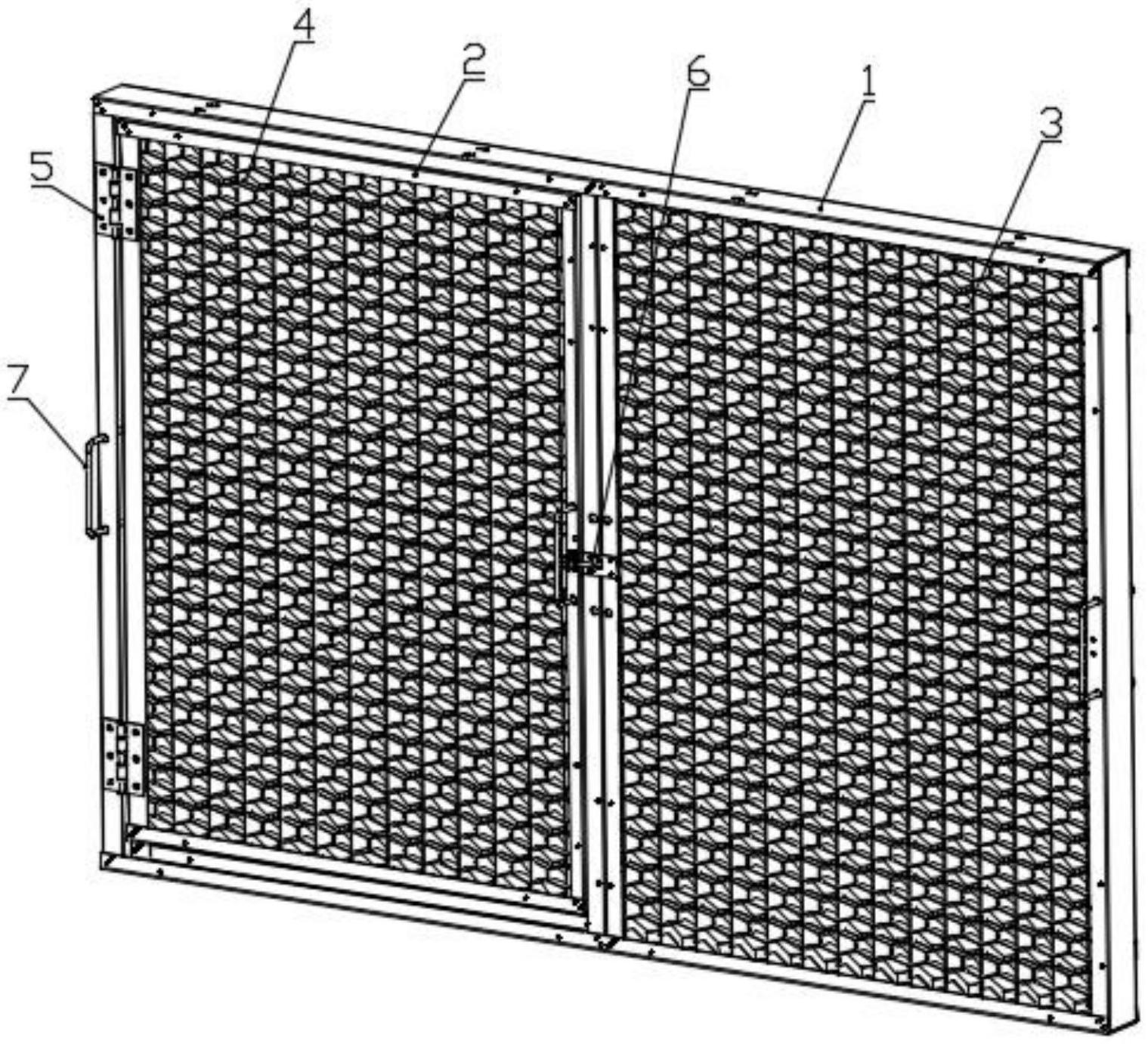 本实用新型公布了一种集成检修门的进风格栅,涉及冷却塔技术领域,包括安装在冷却塔侧壁的矩形固定架,固定架内通过竖梁间隔成两个框,其中一个框内固定安装有第一进风格栅,另一个框内通过合页安装有可打开的检修门框,检修门框内安装有第二进风格栅。本实用新型目的是让进风格栅保留原功能以及可拆卸特性的同时集成检修门,使之带有便捷开关的功能,方便观察塔内情况与进入塔内清洗维护。