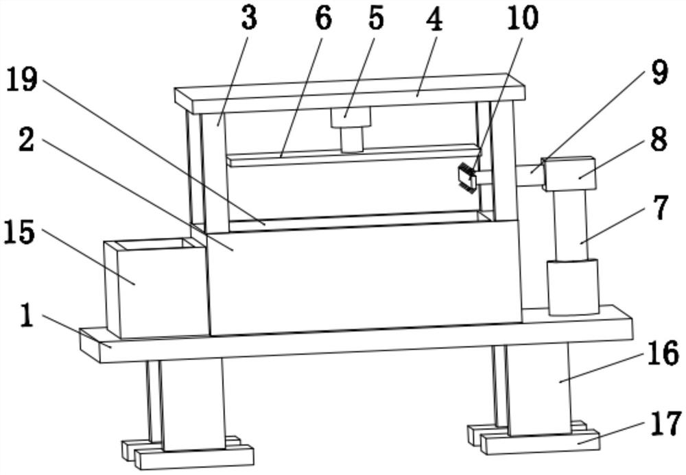 本实用新型公开了一种用于地板加工的模压装置,包括底座、定模箱、支架、横板、第一伸缩杆及动模板,本实用新型通过设置清洁组件,能够对动模板上粘附的油渍和灰尘进行清理,避免了因无法对动模板上粘附的油渍和灰尘进行清理,影响模压装置工作效率的问题的发生,同时还不需要工作人员对其进行清理,减少了工作人员的劳动量,非常的方便;本实用新型通过设置连接座、第四伸缩杆,能够带动推板在定模箱内进行升降运动,从而对定模箱内部型腔的高度进行调节,其调节能力强,便于加工出不同厚度的地板,大大提高了该装置生产的效率,结构比较的简单,操作比较的容易,适应于广泛推广。