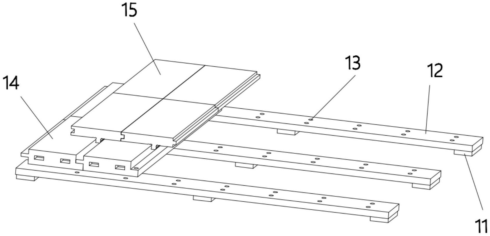 本实用新型公开了一种防火耐磨型抗菌工业地板,包括若干组龙骨,龙骨底部连接有垫块,龙骨远离垫块的一侧连接有若干组支撑板,支撑板连接有用于相邻支撑板拼接的拼接件,支撑板远离龙骨一侧设有防护板,用于增强地板的防护性和对支撑板缝隙处进行遮挡;支撑板一侧连接有第一延伸条,支撑板远离第一延伸条一侧连接第二延伸条;本实用新型结构简单,便于施工,支撑板和防护板的设置能增强结构稳定性,且防护板能对支撑板拼接处的缝隙进行遮挡,减少水分从地板表面侵入地板内部,密封性好,减少地板内部的细菌和潮气;防护板能增强地板的耐磨性,阻燃层和防火层的设置能提高地板的防火性能,提高地板实用性。