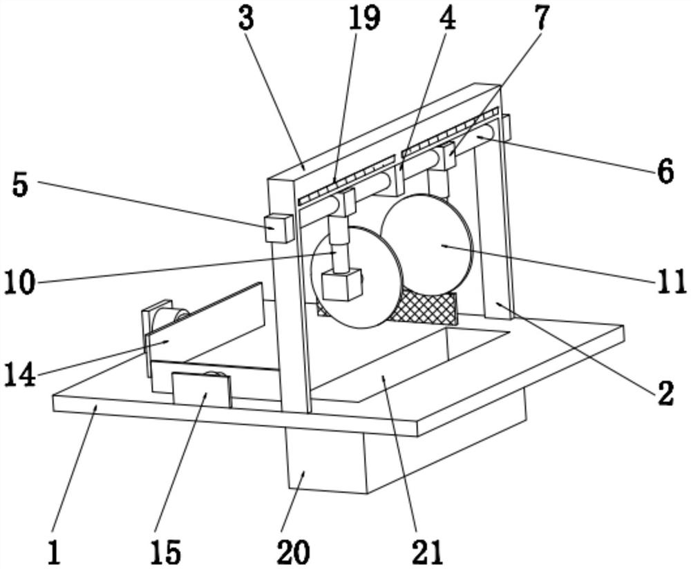 本实用新型公开了一种便于调节的复合地板用切割装置,包括底板,所述底板的上方两侧固定有支架,所述支架的顶部固定有顶板,所述顶板的下方设有两组切割轮主体,还包括调节组件、推动组件以及限位组件,所述调节组件位于所述顶板的下方,且所述调节组件通过第三气缸与切割轮主体连接,所述推动组件位于所述底板的上方且远离顶板的一侧,所述限位组件设有两组,且两组所述限位组件均设置于底板的上方且位于顶板的两侧,本实用新型便于调节两组切割轮主体之间的距离,从而便于对复合地板的分割距离进行调节,通过设有的刻度尺,能够使得两组切割轮主体之间的距离调节的更加准确,从而增加了装置的切割精度与切割效果,便于使用。