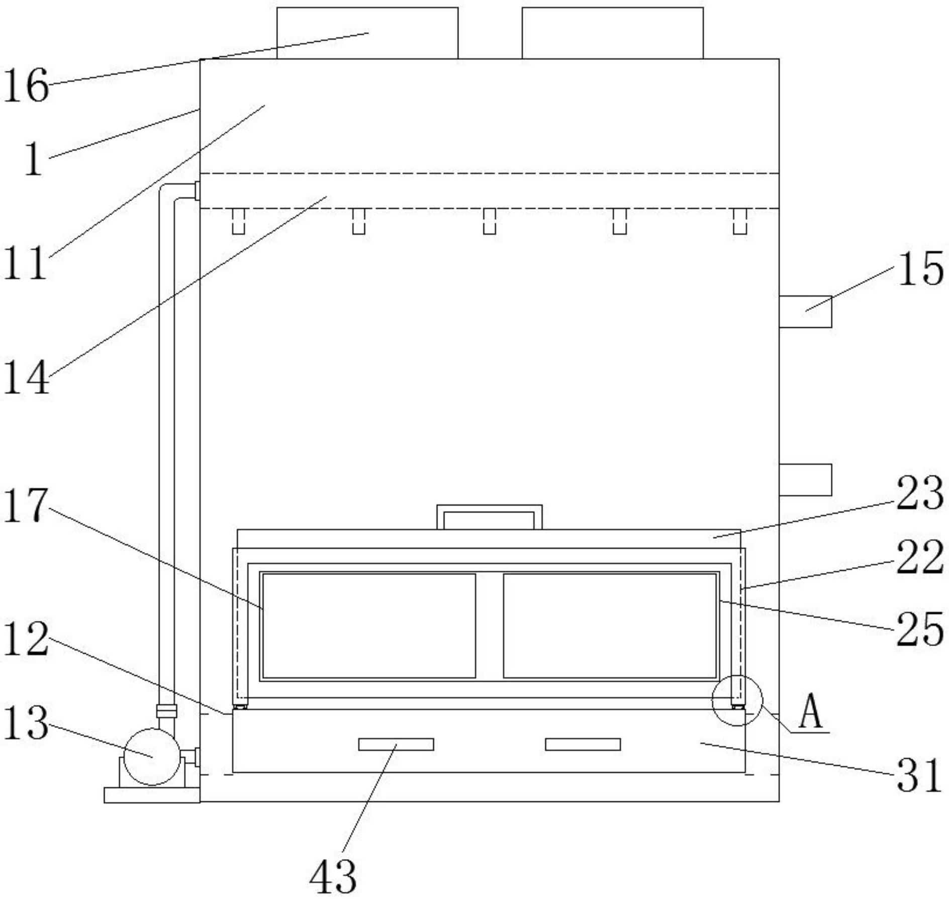 本实用新型涉及冷凝器技术领域,且公开了一种高效换热的蒸发式冷凝器,包括冷却组件;所述箱体前表面设置有过滤组件;所述箱体前表面设置有所述固定架,所述固定架顶部对称开设有所述槽体,所述板体两侧分别嵌入两个所述槽体,所述板体顶部设置有所述提手一,所述板体内部设置有所述滤网,所述滤网覆盖两个所述进风口;固定架可将较大杂物挡下,进入固定架内部的杂物被滤网拦下,在需要对滤网进行更换或者维修时,向上拉动提手一,使板体与固定架脱离后,可对板体内的滤网进行更换或者维修,做到了通过固定架和滤网阻挡杂物进入箱体内部,避免了杂物影响冷凝器的正常使用,且滤网安装和拆卸方式简单快捷,方便工作人员使用。