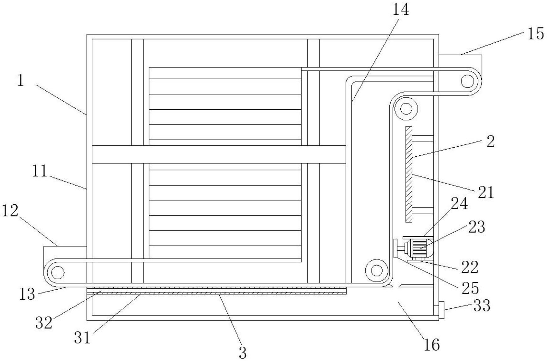 本实用新型涉及速冻机技术领域,且公开了一种带有除霜机构的速冻机,包括螺旋速冻机组件,所述螺旋速冻机组件包括机体、进料口、输送带、隔板、出料口和废水收集箱,所述机体的一侧开设有所述进料口,所述进料口的底部设有所述输送带,所述机体的内部安装有所述隔板,所述机体的另一侧设有所述出料口,所述机体的内部底部设有所述废水收集箱;通过设置加热板,可以对输送带进行加热,减少输送带外表面的冰霜,从而使冰霜变成水滴,而设置电机,可以带动拖把进行转动,从而对输送带的外表面进行清扫,进一步的处理表面冰渣的残留,使输送带保持干净,解决了以往速冻机在长时间使用后,输料机的表面容易产生大量的冰霜,严重影响速冻机的使用的问题。