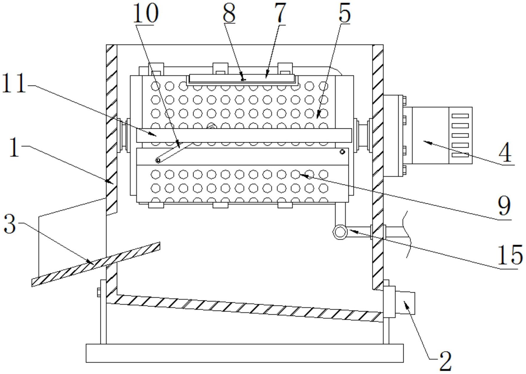本实用新型公开了一种方便去污垢的贝壳粉生产用贝壳原料清理装置,属于贝壳粉生产相关技术领域,包括箱体、出水管和下料槽,所述箱体右侧壁的下端固定连接有出水管,所述箱体右侧壁的上端通过螺栓固定连接有驱动装置,所述网框的内侧固定连接有硬毛刷,所述网框的上侧铰链连接有盖板,所述网框右端的下侧铰链连接有下料板,所述网框的前后两侧均焊接有固定板,所述驱动电机的输出端上固定连接有螺纹杆,所述箱体的内侧壁上固定连接有输水管,且输水管的外侧固定连接有喷头。该方便去污垢的贝壳粉生产用贝壳原料清理装置,便于对贝壳原料进行去污处理,提高了清理的效率,另外方便进行下料,提高了实用性。