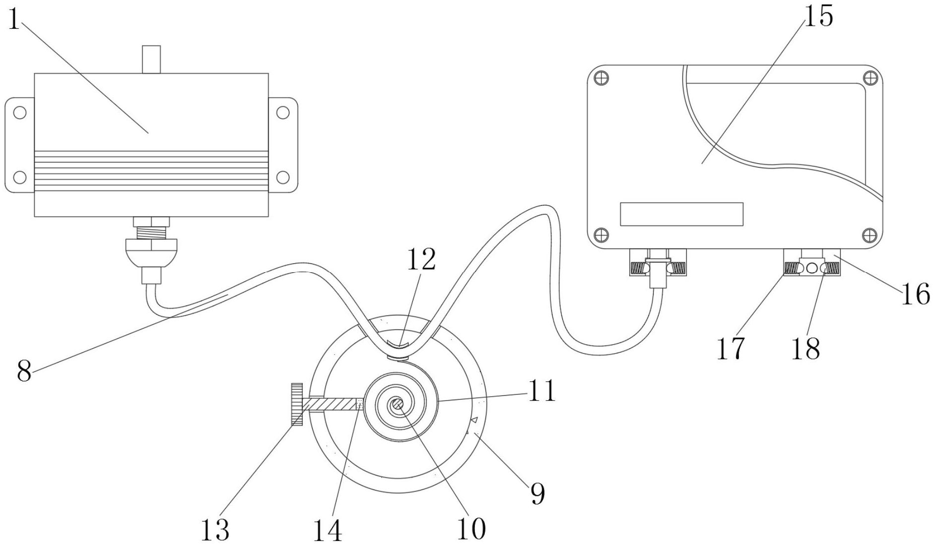 本实用新型公开了一种自动除霜露的室外型温湿度传感器,包括传感元件、支撑块、连接线和变送器,所述传感元件的内部开设有散热孔,所述支撑块连接在传感元件的内部,所述支撑块的一端设置有夹块,所述夹块的内部贯穿连接有转轴,所述夹块的表面连接有连接弹簧。该自动除霜露的室外型温湿度传感器的夹块通过转轴与支撑块之间构成转动连接,且夹块关于防尘板的横向中分线呈对称分布,并且夹块通过连接弹簧与传感元件之间构成弹性联动结构,将传感元件侧板打开后,按压夹块,使夹块转动并带动连接弹簧进行拉伸,再将防尘板放置在夹块的一侧,通过连接弹簧的弹性进行夹紧固定,以便于对传感元件的内部起到防尘的作用。