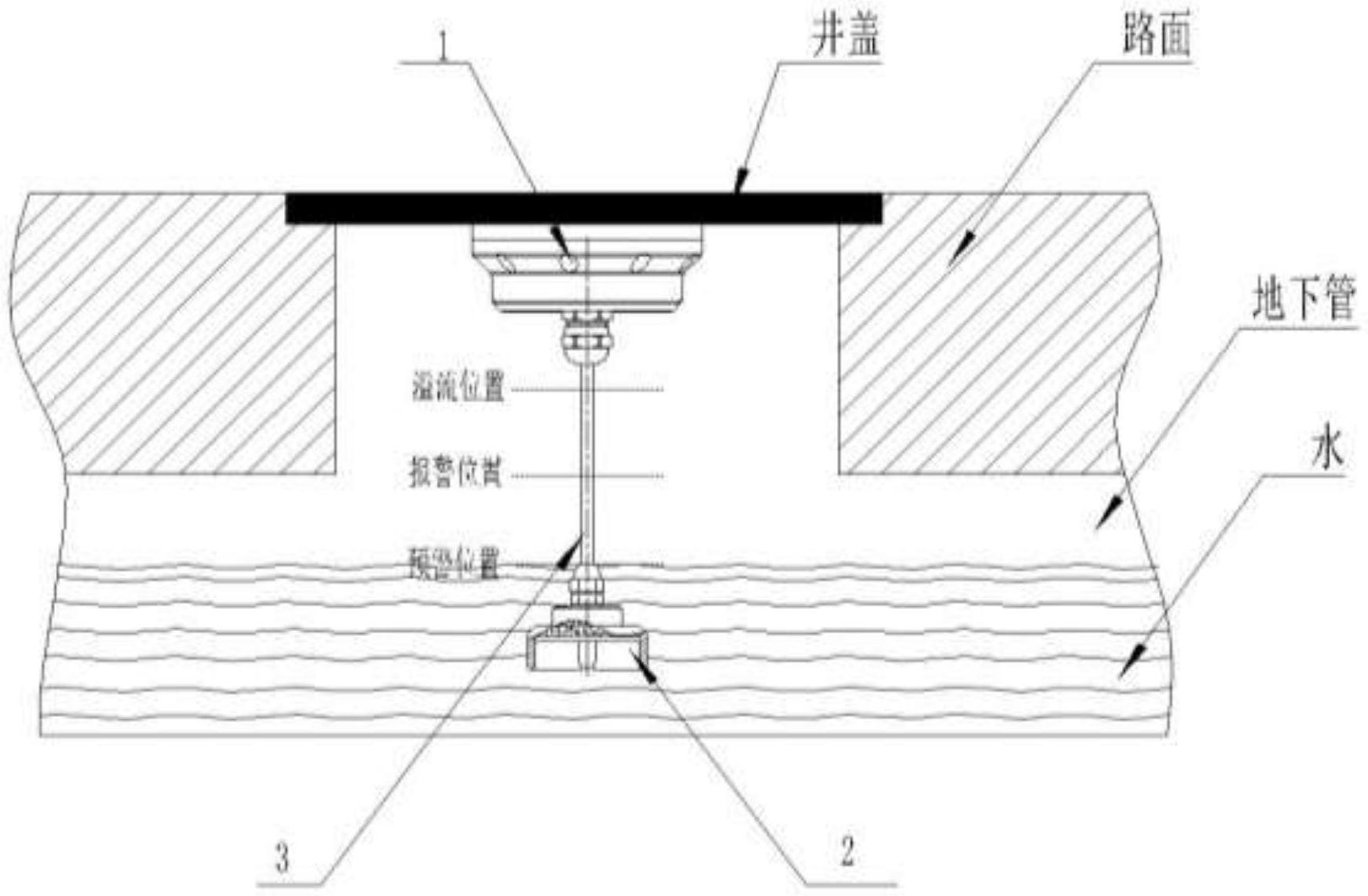 一种外置式井盖水浸传感器,包括固定在井盖内表面上的水浸传感器本体,所述水浸传感器本体上设有向井下伸出的水浸探头,所述水浸探头与水浸传感器本体之间通过电缆连接,所述水浸传感器本体内设有用于检测电缆电容值变化的检测模块。本装置采用的是电容式液位检测原理,根据水淹没电缆的深度变化而产生电缆电容值变化,然后经过电路板处理,可任意设置多点位报警输出,可实现提前预警功能,传感器本体不用泡水即可检测,相对于传统井盖水浸传感器,防护等级不需要那么高,可减低传感器故障概率,降低安全隐患。