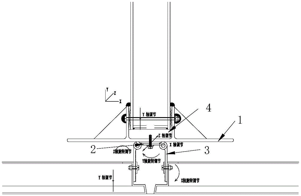 本实用新型公开了一种扭转双曲面金属板幕墙三维调节结构,通过设置在安装板上的进出调节槽在Y轴方向调节安装板,通过第二转接件上的长圆孔在Y轴方向调节金属板,通过移动第一转接件在X轴方向和Z轴方向进行调节完成金属板安装的初定位,通过第二转接件绕第一转接件转动完成金属板绕转轴方向的调节定位,通过第二转接件的长圆孔完成金属板的上下调节定位,同时金属板绕第二转接件上的螺栓转动,通过以上的三维的金属板调节定位,有效保证了金属板的安装精度,使其可适应双曲面等异形金属板幕墙的应用。此实用新型用于建筑幕墙领域。