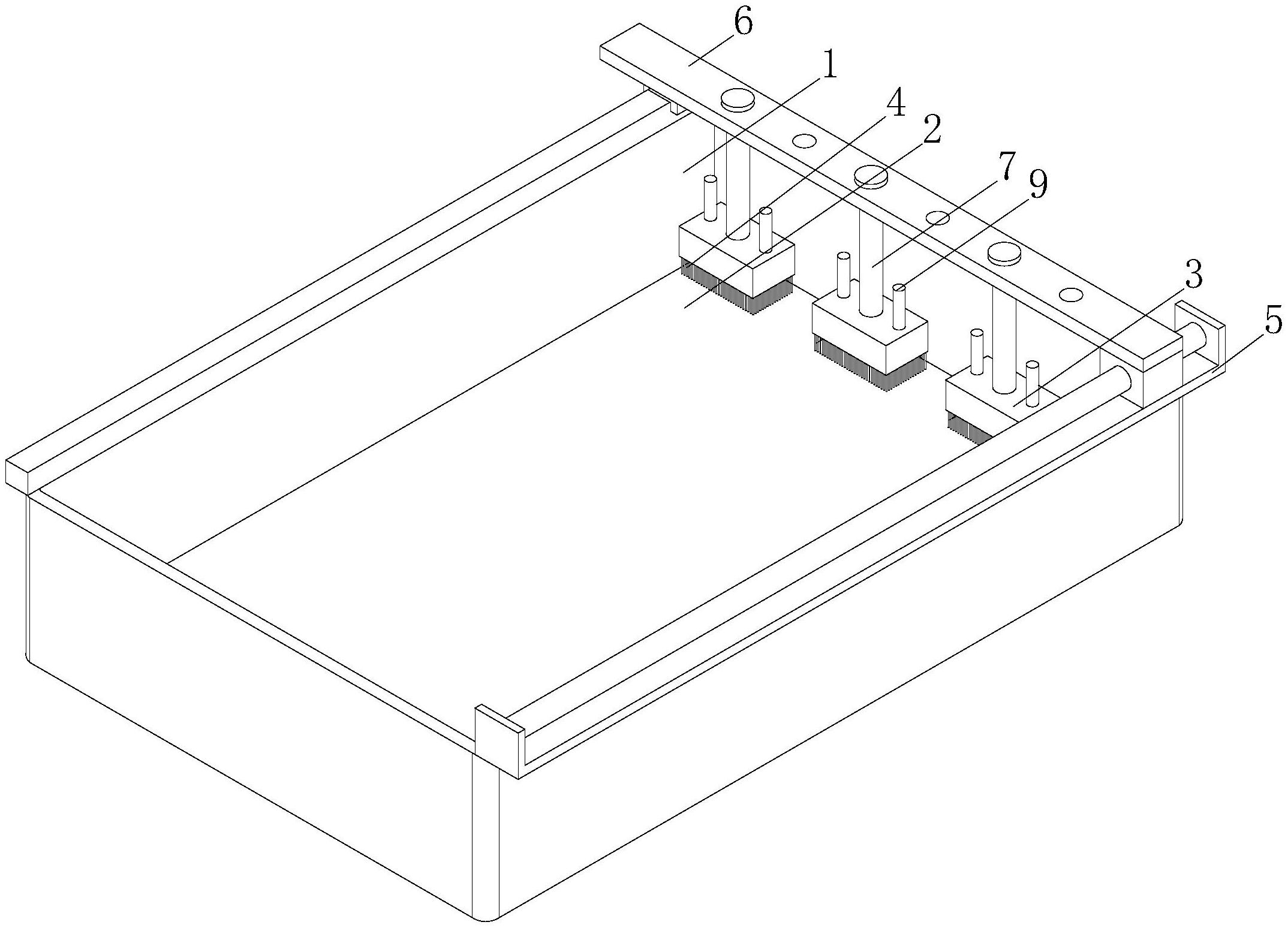 本实用新型涉及检测装置技术领域,且公开了一种涂料制备用的检测装置,包括敞口盒,所述敞口盒向上敞口;所述敞口盒的顶部沿长度方向安装有往复驱动机构;所述敞口盒的内部放置有涂覆板,所述涂覆板的上方设有多个连接块,所述连接块的底部设有刷动件;所述往复驱动机构上插放有连接件,所述连接件的一端滑动伸入连接块的内部。本实用新型提出一种涂料制备用的检测装置,本实用新型通过往复驱动机构带动刷动件对涂覆板上的涂料层进行刷动测试,多个同时检测降低实验检测的偶然性,同时利于更换和配重物体,增加实验的灵活性。