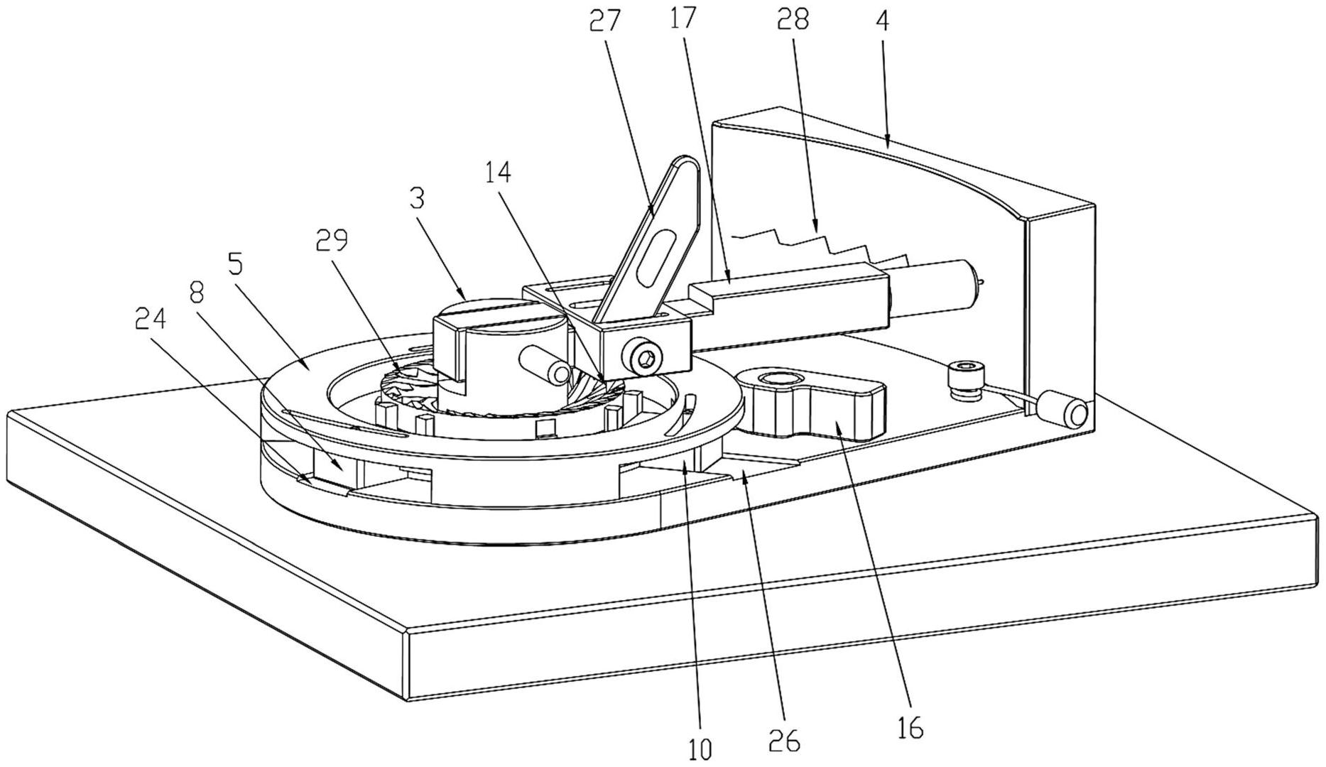本实用新型公开了一种机械式研磨盘齿形扫描仪,主要包括测量执行机构的旋转座,杠杆,杠杆前端的扫描笔,杠杆上安装的探头,与研磨盘同步转动的扫描屏;被测对象固定机构的定位环,滑块,定位锁紧器;使用极薄的硬质高碳钢作为探头,在转动的研磨盘的特定半径的齿面上作连续接触,通过杠杆放大原理,用扫描笔描绘出被测齿面的径向截面的放大轮廓线,便于用其它工具继续作量化的测量分析,并减少了精度误差;被测量的研磨盘通过三个曲槽同步驱动的三个滑块作定位,保证了测量时截面半径的同心度,并方便重复放置,提高了工作效率;定位锁紧装置使被测量的研磨盘稳定牢固,保持与扫描屏同步转动,保证了测量的可靠性。