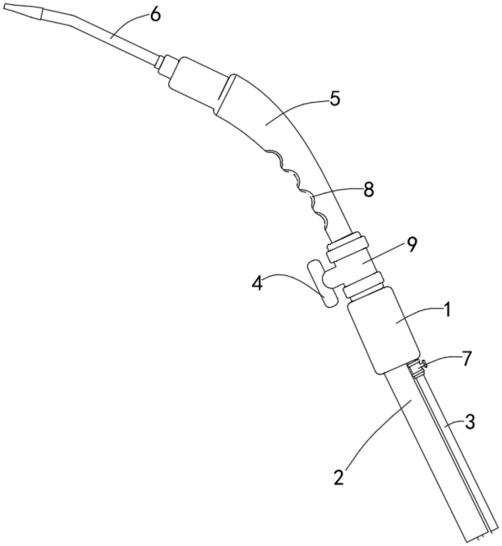 本实用新型公开了一种海参清洗装置,属于清洗装置领域,包括连接头;连接头为圆管,所述连接头一端连通有主管和副管,主管内径大于副管内径,主管内径小于连接头内径;所述连接头另一端连通在出水管一一端,出水管一上安装有阀门。打开控制阀就可以让清洁液流出使用清洁液来清洗,可以方便快速的不停机的情况下出现清洁液。阀门打开就可以工作,解决了背景技术提到的手紧握住喷枪开关装置才能喷射的问题,减轻了使用者清洗过程的疲劳。这样打开控制阀能喷出清洗剂,非常方便快速的实现清水混合清洗剂清洗。