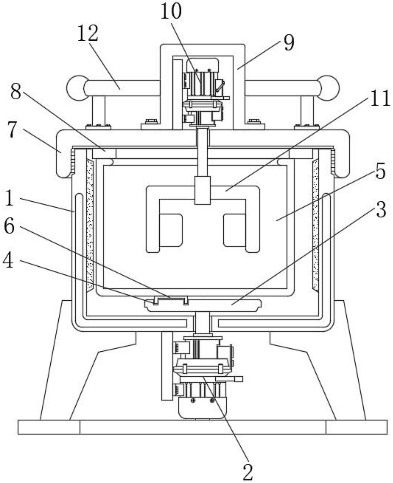 本实用新型涉及皮蛋粥生产设备技术领域,具体为一种皮蛋粥生产用振动成糊混匀装置,包括外胆、第一电机、第二电机和控制面板,所述外胆的底部中间位置固定安装有第一电机,且第一电机的转动输出轴上固定安装有甩动盘,所述甩动盘的顶部开设有槽口,所述外胆的内部放置有内胆。本实用新型通过设置槽口偏心开设在甩动盘的顶部,配合连接环卡合在槽口的内部,使得该装置在使用时,通过第一电机的转动带动甩动盘转动,从而使得内胆在外胆内部甩动,同时,通过第二电机通电启动后带动搅拌叶转动,两者相互配合,使得内胆内部放置的皮蛋粥与辅料混合均匀,且在甩动下振动成糊,有利于使得老人以及病人对该装置生产的皮蛋粥吞咽方便。