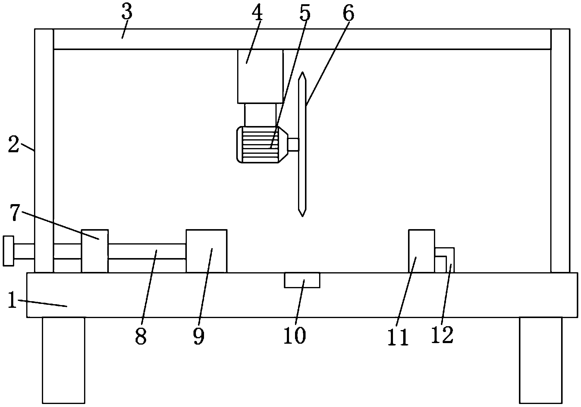 本实用新型涉及装饰板加工技术领域,且公开了一种室内装饰板加工用裁剪装置,包括底座,所述底座顶部的四角均固定连接有固定杆,四个所述固定杆之间的顶部固定安装有顶板,所述顶板的底部固定安装有液压伸缩杆。该室内装饰板加工用裁剪装置,通过张紧弹簧将L型支撑板向下推动,使其与固定槽连接更为稳固,从而通过L型支撑板对限位板进行固定,避免其在使用过程中左右移动,然后将待加工的装饰板放置在活动板和限位板之间,此时转动螺纹杆,通过螺纹杆带动活动板向右移动,至活动板的右侧与装饰板接触,从而通过活动板和限位板对其进行固定,避免其在裁剪过程中随意晃动,从而达到了结构简单,且便于调节裁剪尺寸,提高裁剪效率的目的。