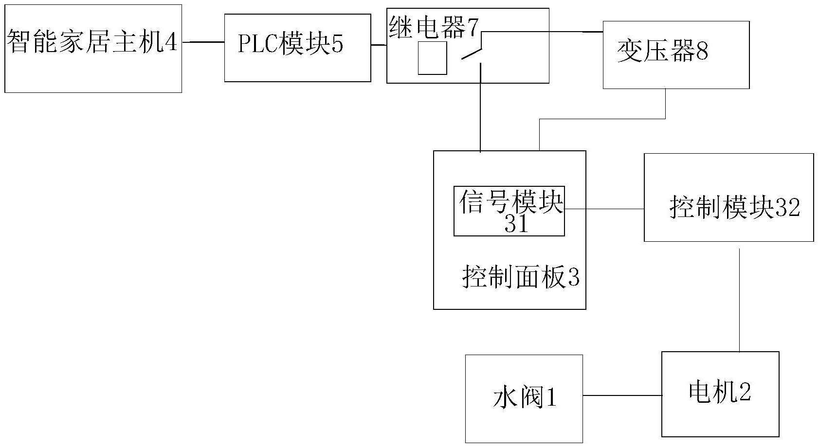 本实用新型公开了一种基于PLC控制技术的超静音水阀控制装置,包括用来控制水阀开启或关闭的电机及用来控制电机工作的控制面板,所述控制面板内设置有用来与智能家居主机电连接的信号模块,所述信号模块通过PLC模块与智能家居主机电连接,所述电机与水阀之间设置有减速齿轮组,所述减速齿轮组的外侧设置有隔音罩,所述隔音罩的内壁上设置有隔音层。接入家庭的智能家居网络,通过PLC协议实现通讯,通过智能家居网络最终驱动电机进行工作,从而实现智能化控制水路的通断的目的,其设计更加地方便且合理。