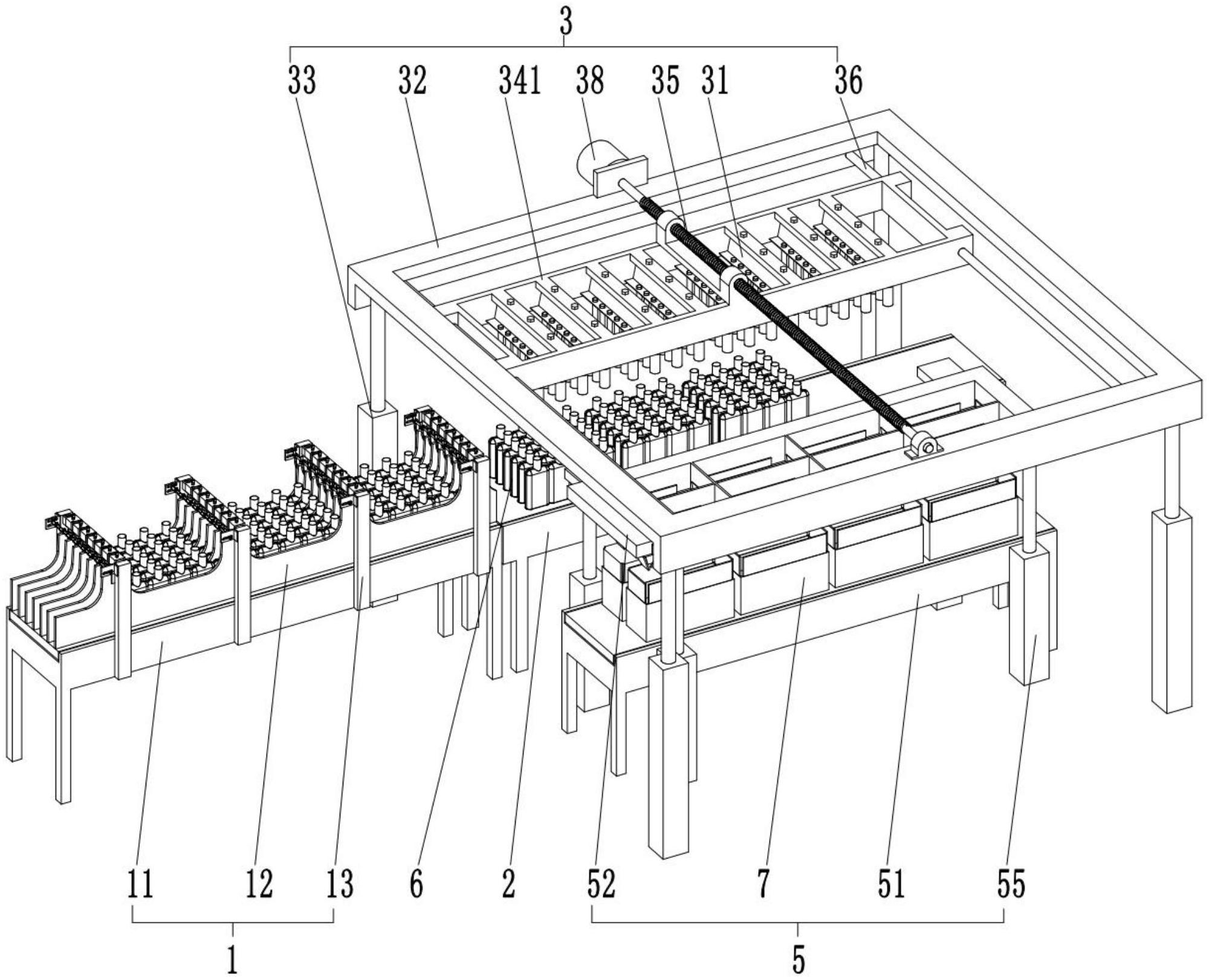 本实用新型公开了一种酒瓶装箱传送线,包括沿酒瓶传送方向设置的酒瓶传送线、第二传送架、酒瓶转移机构和酒瓶装箱机构,酒瓶转移机构可将酒瓶从第二传送架转移到酒瓶装箱机构;酒瓶转移机构包括可上下升降的第一升降架,第一升降架位于第二传送架和酒瓶装箱机构的上方,第一升降架内部设有可移动的转移架,转移架可从第二传送架上方移动到酒瓶装箱机构上方,转移架内部设有多个第二连接板,第二连接板下部设有抓取单元,抓取单元可抓取酒瓶。本实用新型在黄酒灌装后通过酒瓶传送线、酒瓶转移机构和酒瓶装箱机构对黄酒进行装箱,实现酒瓶的自动化装箱,结构简单合理,效率高,安全可靠,成本低。