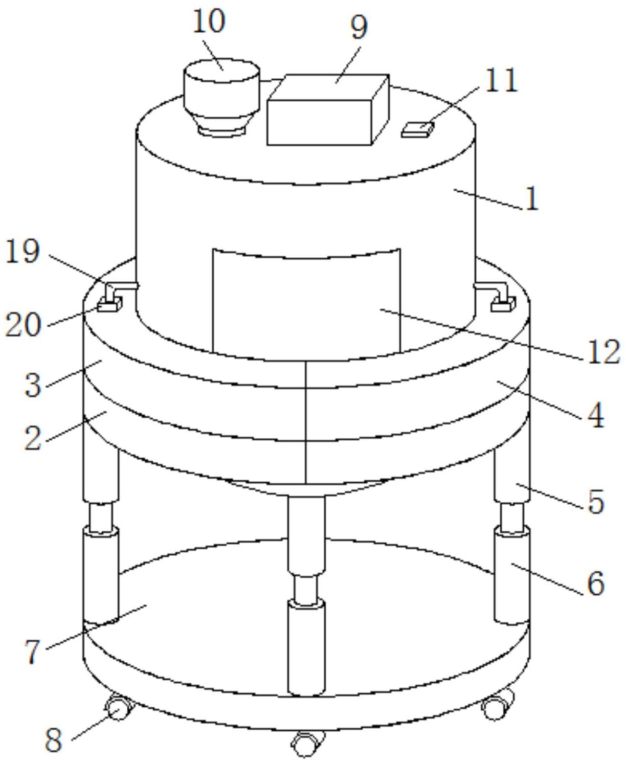 本实用新型公开了一种可快速调温和均衡控温的搅拌型谷物浊液酶解罐,包括罐体,所述罐体的外侧固定安装有固定台,所述固定台的上侧设置有冷水箱,所述冷水箱的右侧设置有热水箱,所述固定台的下侧固定安装有支撑柱,所述支撑柱的下侧设置有伸缩柱,所述伸缩柱的下侧固定安装有底板,所述底板的下侧设置有万向轮。该可快速调温和均衡控温的搅拌型谷物浊液酶解罐,可以快速调温和均衡控温,使用起来十分方便,搅拌棒、搅拌叶和刮边板对谷物浊液进行搅拌,加快酶解速度,同时也能防止浊物沉淀在桶体的底部,使得清洗起来更加方便,支撑柱的内侧设置了弹簧,可以起到减震的作用,防止在搅拌的过程中罐体晃动得太厉害。
