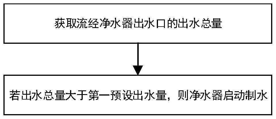 本发明涉及净水设备技术领域,具体公开了一种净水器的控制方法及净水器。净水器包括压力桶,压力桶与净水器出水口之间的管路上设有流量检测计,流量检测计用于检测流经净水器出水口的单次出水量。净水器的控制方法包括:获取流经净水器出水口的出水总量,若出水总量大于第一预设出水量,则净水器启动制水;其中,第一预设出水量小于压力桶的容量。本发明提供的净水器的控制方法,在净水器的出水总量大于第一预设出水量时才会启动制水,在用户单次少量用水且频繁接水时,净水器不会频繁启动制水,且也不会影响用户正常接水,利用了压力桶的使用性能,延长了泵、阀、压力桶等元器件的使用寿命,降低了净水器运行的噪音,提高了用户使用的满意度。