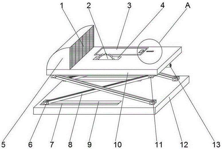 本实用新型涉及切割机技术领域,尤其为一种用于竹地板加工的切割机,包括底座、连接板以及切割机主体,所述切割槽的内部设有切割齿轮,所述切割机主体的顶部固定开设有卡槽,所述卡槽的内部设有卡件,所述切割机主体的底部固定安装有摇杆,所述连接板的顶部设有半圆把手,所述连接板的一端固定安装有卡板,所述卡板的一侧设有刻度尺,所述卡板的一侧固定开设有卡孔,本实用新型通过设置的连接板以及卡板,当需要对被切割件进行斜切或需要切割固定角度时,半圆把手将连接板拉起,通过查看刻度尺对其进行角度调节,当调节到所需角度时将卡件卡接在卡孔中,使连接板固定在所需要的角度,使得设备使用时,能够快速进行角度调节,更加方便快捷。