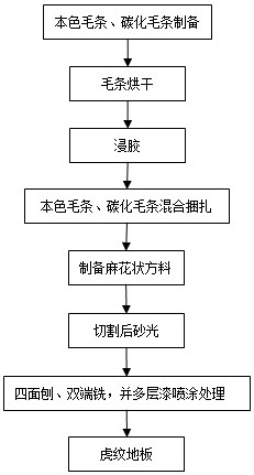 本发明提供一种麻花竹地板的生产方法,制备本色毛条、碳化毛条;毛条烘干;使用浸胶装置将泡胶,在毛条充分泡胶后,将本色毛条、碳化毛条使用双层传输式烘箱进行烘干至水分比7‑15%,得到本色胶水条、碳化胶水条;将本色胶水条以左宽右窄、碳化胶水条以左窄右宽的方式并以7:3或3:7的体积比进行捆扎后得到捆扎条;制备麻花状方料;进行砂光处理后,进行四面刨、双端铣,再进行多层漆喷涂处理,得到麻花竹地板。通过将一定比例的本色毛条与碳化毛条在制备麻花状方料前进行扭转混合,扭转使麻花状方料形成图案,使最终制备的竹地板自带有图案,且由于碳化毛条嵌入在本色毛条中,从而图案稳定性得到保证,不会产生图案脱落等问题。
