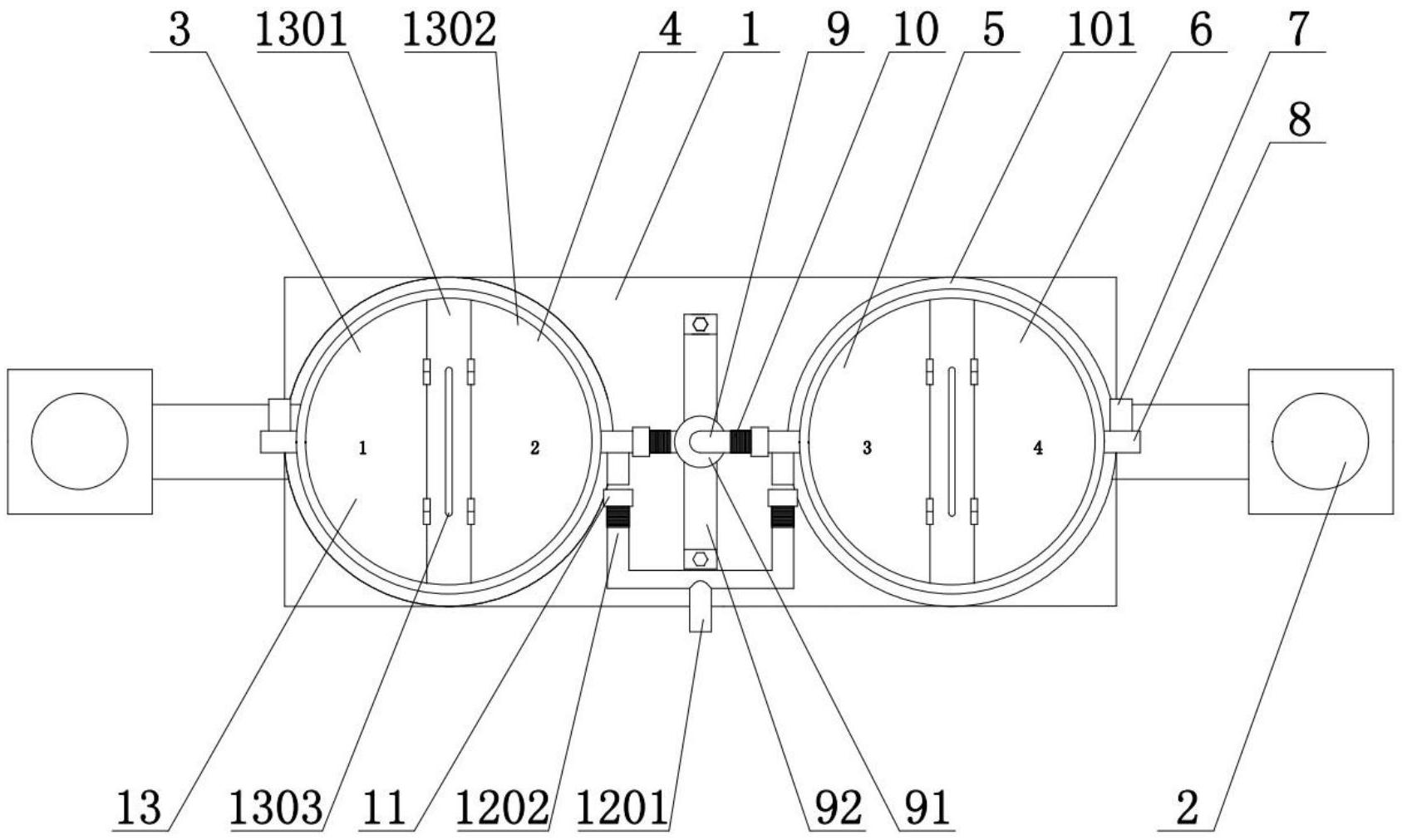 本实用新型涉及一种环保润版液配置用纯净水超滤装置,包括底座和两个滤筒,两个滤筒置于支撑座上,支撑座通过转轴转动连接在底座上,且转轴连接驱动滤筒转动的驱动电机,滤筒内均设置中隔板,两个滤筒通过两块中隔板分成第一、第二、第三和第四半滤筒,第一、第二、第三和第四半滤筒均连接下进水三通和上出水管,两个滤筒之间设置转接机构,转接机构包括“Z”形转接管,“Z”形转接管的竖直管转动连接在转座上,转座通过支架连接底座,“Z”形转接管两端通过伸缩管连接快速接头,两个快速接头分别连接上出水管和下进水三通,下进水三通还连接进水管,所述环保润版液配置用纯净水超滤装置,持续进行超滤操作,提高利用率和配置效率。