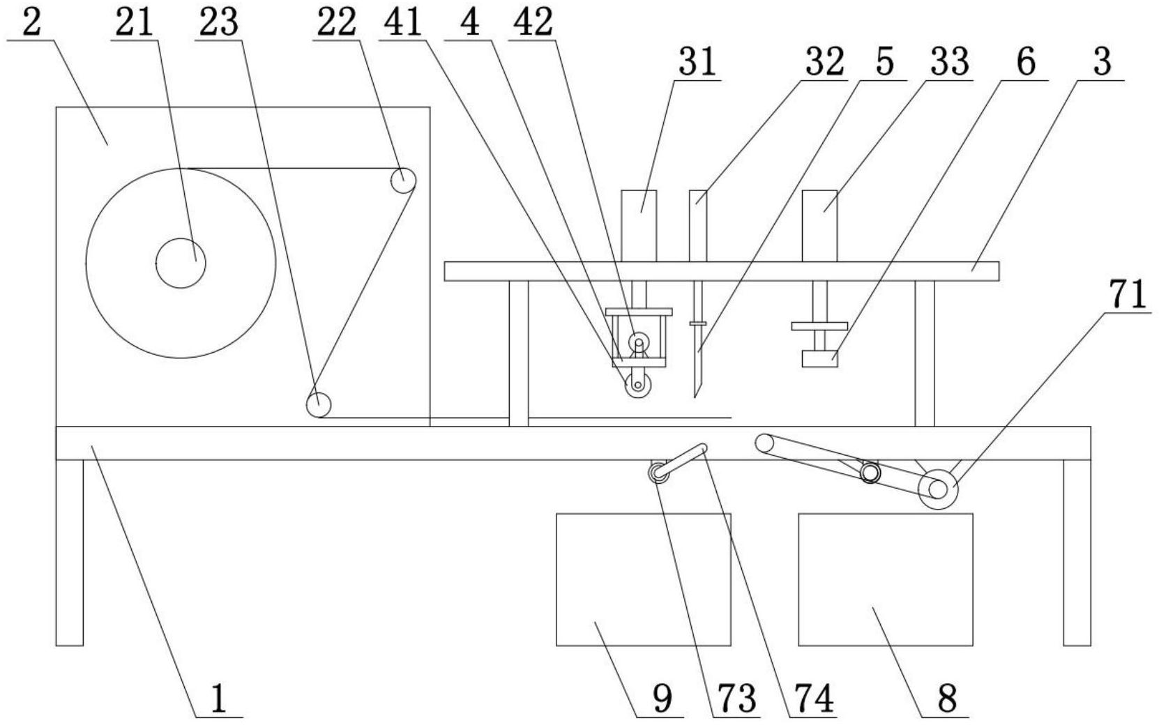 本实用新型涉及一种PRID票据检测模切分料机构,包括设置安装侧板和安装支架的操作台,安装侧板上安装放线辊和导辊,安装支架上连接第一、第二、第三升降驱动部件,第一升降驱动部件下端连接升降架,升降架下端连接票据压轮,票据压轮与升降架上的压轮转动电机连接,第二升降驱动部件下端连接模切刀,第三升降驱动部件下端连接票据压块,操作台位于模切刀和票据压块下端的位置上转动连接分料转板,分料转板内安装解读器,分料转板连接驱动其转动的转板转动电机,且分料转板配合模切刀开设切料通槽,操作台位于分料转板下端两侧分别设置合格品收集框和废品收集框,所述PRID票据检测模切分料机构,自动进行分切,并将PRID票据按可读和不可读进行分料。