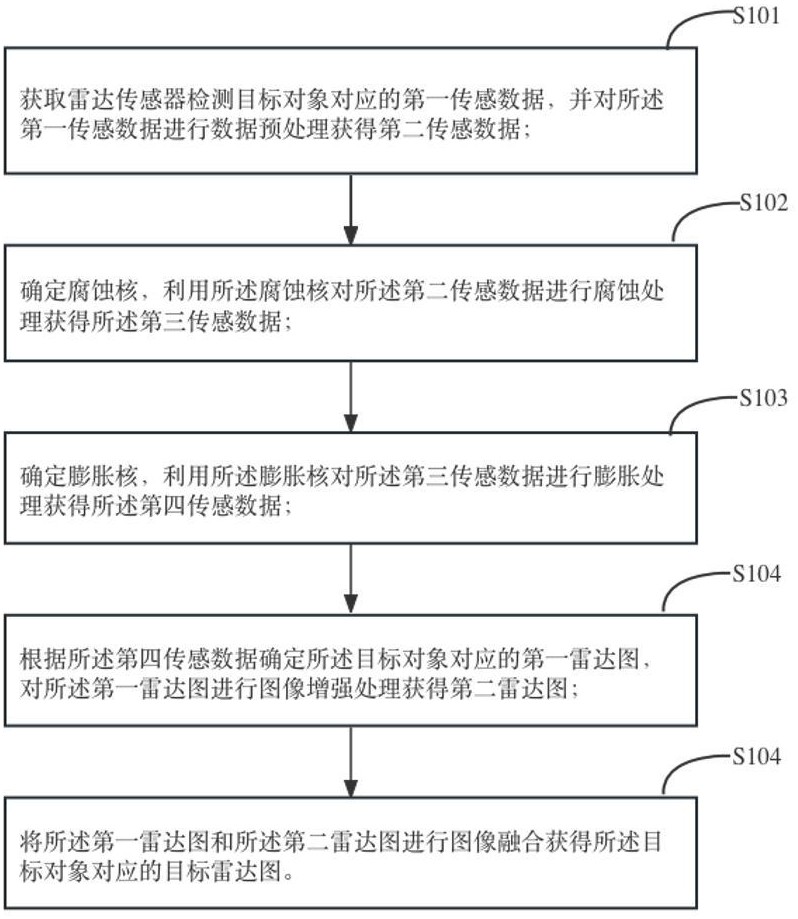 本发明实施例提供一种雷达图的生成方法、装置、终端设备及可读存储介质,属于数据处理技术领域。该方法包括:获取雷达传感器检测目标对象对应的第一传感数据,并对第一传感数据进行数据预处理获得第二传感数据;确定腐蚀核,利用腐蚀核对第二传感数据进行腐蚀处理获得第三传感数据;确定膨胀核,利用膨胀核对第三传感数据进行膨胀处理获得第四传感数据;根据第四传感数据确定目标对象对应的第一雷达图,对第一雷达图进行图像增强处理获得第二雷达图;将第一雷达图和第二雷达图进行图像融合获得目标对象对应的目标雷达图。解决了相关技术中生成的雷达图质量和可用性较低,导致雷达图在检测和跟踪目标时效果较差的问题,并提高了雷达图的生成质量。