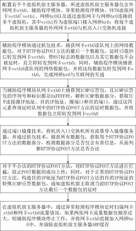 本发明公开了一种大规模云环境中分布式部署的HTTP协议POST拦截方法,通过端口镜像技术,对机房入口交换机的所有流量进行抓包、TCP/IP数据重组、HTTP解析等方式,获取每个HTTP请求POST方法的数据部分,对数据部分采用规则匹配等方式,根据匹配结果判断是否为恶意访问,并采取基于旁路的TCP连接重置技术,配合在云主机的宿主服务器上运行的POST数据包延时辅助程序,完成对HTTP协议POST数据包的分析与拦截;本文介绍的技术方案,在对现有网络环境影响较小、风险较低和方便管理的情况下,对通过HTTP协议POST方法上传的木马、病毒、违法信息和SQL注入攻击等有害信息进行拦截。