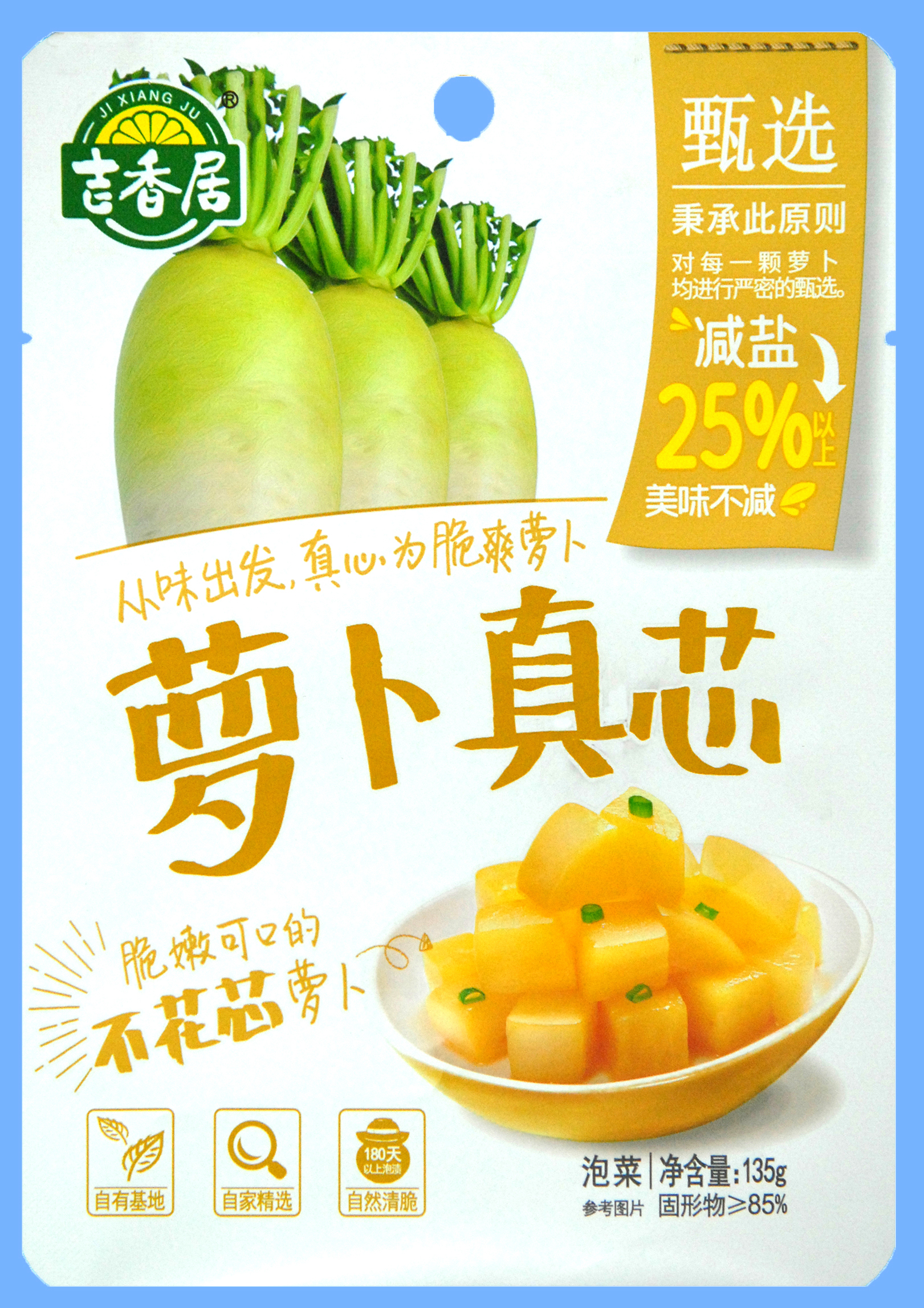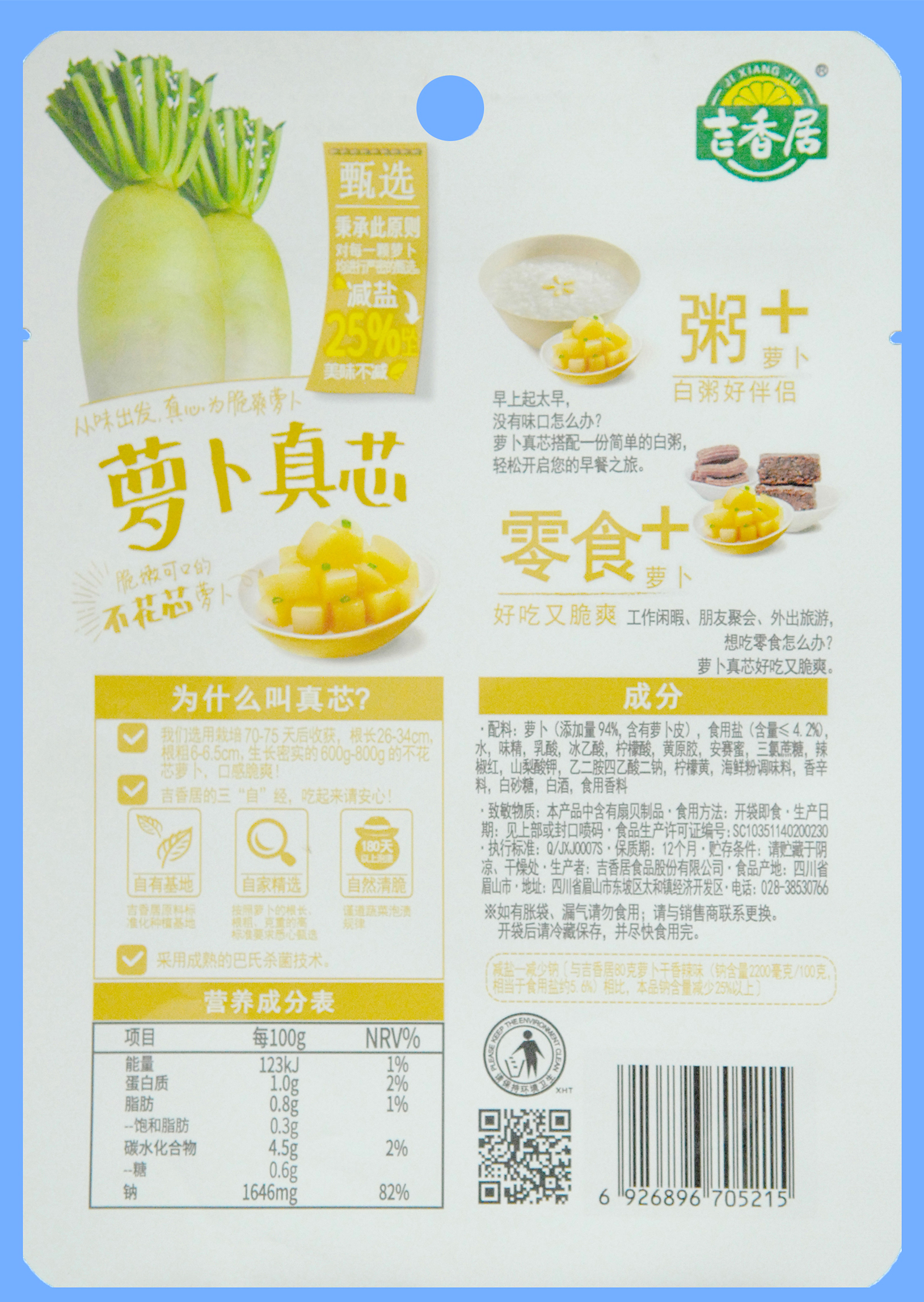 1.本外观设计产品的名称:包装袋(萝卜真芯)。2.本外观设计产品的用途:用于食品包装。3.本外观设计产品的设计要点:在于图案。4.最能表明设计要点的图片或照片:主视图。5.本外观设计产品为薄型产品,省略左视图、右视图、俯视图、仰视图。