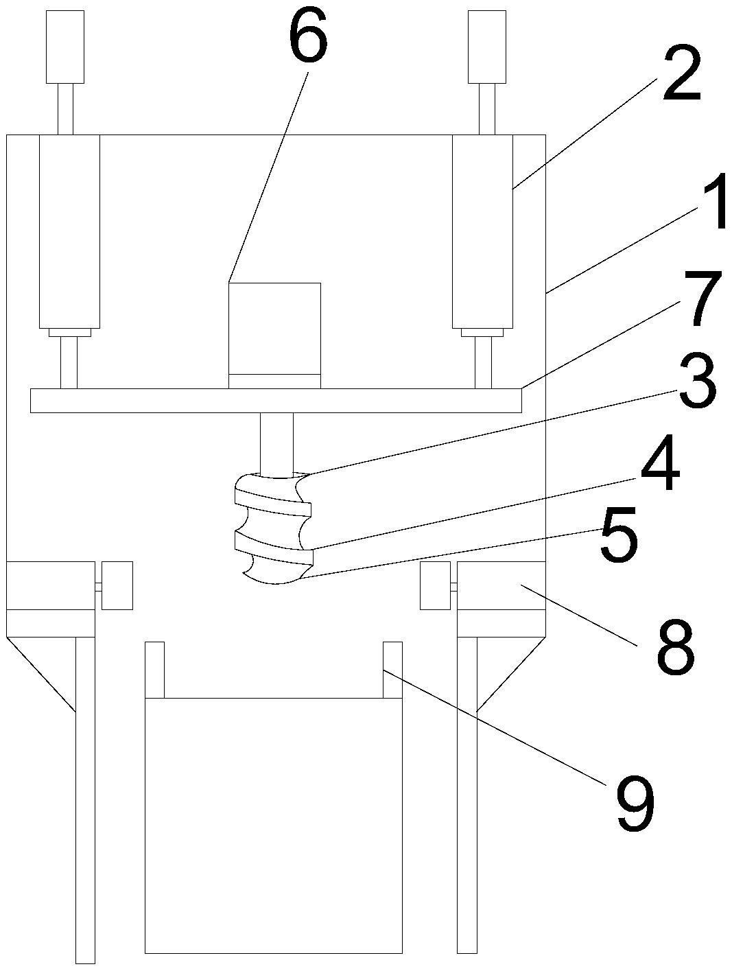 本实用新型涉及食品罐装技术领域,具体涉及一种瓶装自动压菜设备,用于泡菜罐装,包括机架,所述机架上部设置有升降装置,所述升降装置连接有螺旋压菜头,所述螺旋压菜头上设置有螺纹刮刀,所述螺纹刮刀从所述螺旋压菜头上部延伸到所述压菜头下部,所述螺旋压菜头底部为凸弧底,所述螺旋压菜头上部连接有用于旋转所述螺旋压菜头的驱动装置。通过设置螺纹刮刀,能够方便的对挂壁菜进行处理,提高压菜效率。通过设置凸弧底,能够将面层菜向四周挤压,留出顶油的空间,使顶油能够正常的隔绝空气。