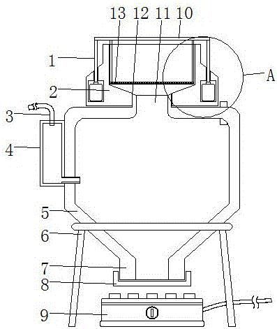 本实用新型公开了一种回收盐筛选除杂装置,包括筛分器、除杂炉、电磁炉和固定环,所述除杂炉的一侧上端固定有液体盒,所述液体盒的上端贯穿安装有导液管,所述除杂炉的前端面中间处嵌入安装有观测窗,所述除杂炉的上端面中间处贯穿安装有进料管,所述筛分器的内部开设有漏槽,且漏槽套接在进料管上,所述漏槽内部上端滑动安装有滤网,所述滤网上阵列安装有连接杆,所述连接杆背离滤网的一端固定在固定环上,所述筛分器的内部开设有内置槽,所述内置槽内固定有振动电机,所述振动电机的上端通过固定杆与固定环连接。本实用新型具备物力和化学双重的除杂,效率更高且节约成本,同时节省了劳动力的优点。