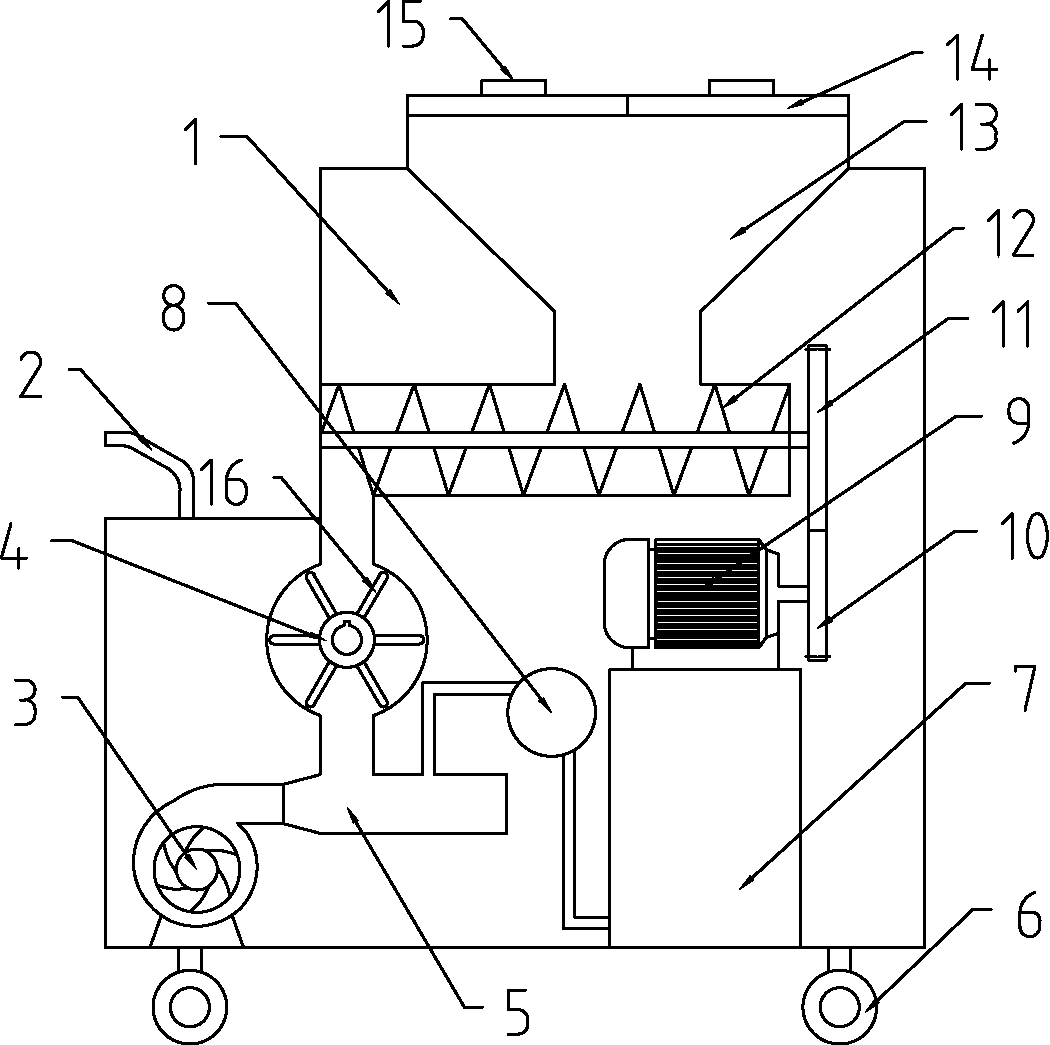 本专利公开了一种自动撒盐机,包括机架、料斗、螺旋进料器和空气与料混合仓,料斗设在机架上,料斗与螺旋进料器连通,螺旋进料器与空气与料混合仓连通,空气与料混合仓连通有风机,螺旋进料器与空气与料混合仓之间连接管道内设有转盘,转盘周向上均布有若干挡板,挡板远离转盘一端与管道壁滑动连接;还包括设置在机架上的储水箱,储水箱连有水泵,水泵与空气与料混合仓相连通;与现有技术相比,本专利转盘和挡板的设置,可防止风机制造出的风倒灌入螺旋进料器内,可防止盐料从料斗内吹洒出来;使用风机将落至空气与料混合仓内的盐料喷出,并使用水泵对盐料进行加水,防止了对周边环境造成污染,防止了对操作人员造成伤害,并可减少盐料的浪费。