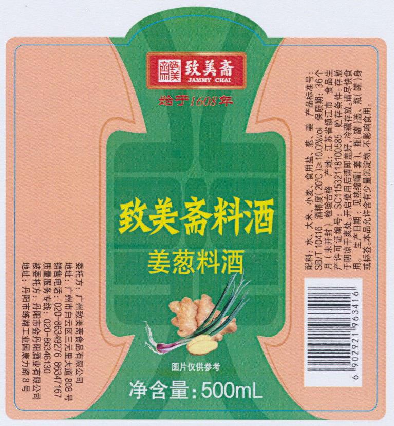 1、本外观设计产品的名称:瓶贴(致美斋姜葱料酒);2、本外观设计产品的用途:用于瓶子外面的标贴;3、本外观设计的设计要点:在于主视图图案和色彩结合;4、最能表明设计要点的图片或照片:主视图;5、本外观设计产品为瓶贴,是一圈绕于瓶子外面的,故省略后视图;6、请求保护的外观设计包含色彩。