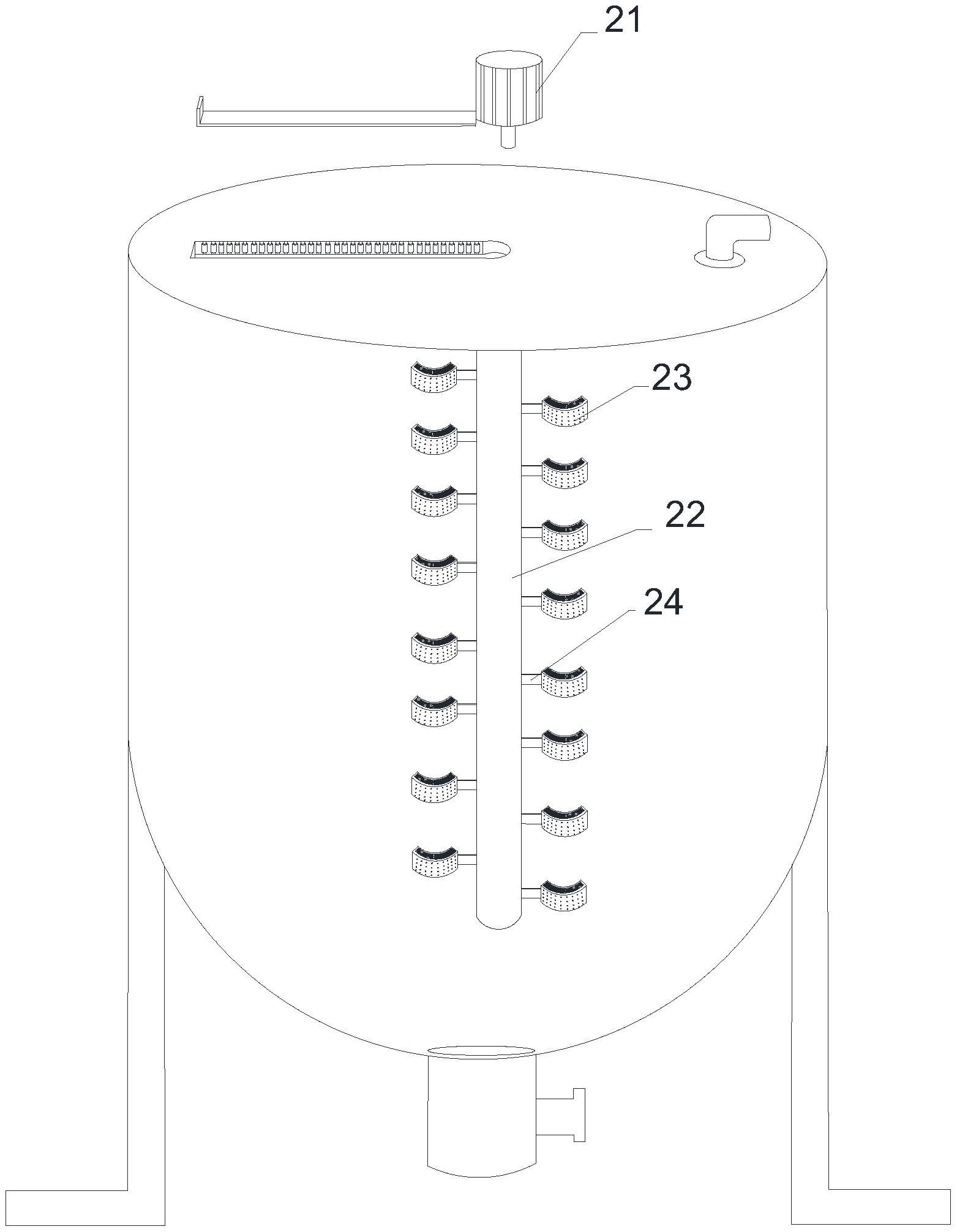 本实用新型公开了一种食醋生产用过滤装置,属于白醋脱色技术领域。包括罐体和搅拌装置,所述罐体的顶部设置有进料口、转动孔、滑孔和防尘盖,罐体的底部设有半球端、出料口、阀体和支撑脚,罐体的一侧设置有操作口和门扇,搅拌装置包括电机、搅拌轴、过滤盒,电机的一端穿过罐体后与搅拌轴连接,过滤盒与搅拌轴之间设置有连接柱,过滤盒内部设置有隔板,隔板的两侧分别设置有树脂块和碳酸氢钠块,过滤盒上设置有多个滤孔,过滤盒的上侧包括通口,通口上设置有盖体。通过提供一种食醋生产用过滤装置,可以提高吸附脱色的效率,树脂脱色还可以吸附微生物,去除食醋中的异味,且树脂在潮湿后不易松散,使用周期更长。