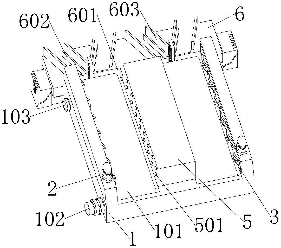 本实用新型提供了连续式洗瓶机分瓶辅助装置,本实用新型涉及洗瓶机技术领域,中块左右两侧均匀嵌入设置有若干个嵌珠,且嵌珠与中块滚动连接,工作台内壁左右两端均开有预留槽,且预留槽内部呈平行均匀设置有若干个侧滚筒,侧滚筒顶端中部转动连接有齿轮焊接在工作台后端,且出料板前端左右两侧均开有凹槽,出料板后端且位于凹槽后端左右两侧均开有安装槽,分瓶结构较简单,即使后期出现损坏,使用者也可较快速的对结构进行更换或维修;解决了瓶子很容易抵到导瓶栏珊上,导致后面的瓶子堆积上来,瓶子之间相互碰撞,增加了不良品率,分瓶结构大多较精密,维修起来较为不便,增加生产成本的问题。