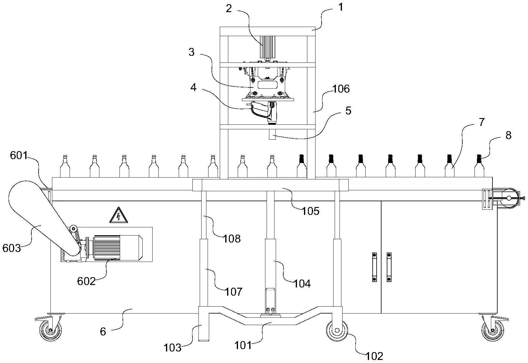 本实用新型公开了一种应用于生产线的热缩膜收缩装置,属于热缩膜加工技术领域。包括机架、升降气缸、安装架以及热风机;所述机架包括底座、滚轮、支腿、升降杆、升降平台以及顶部支架;所述升降气缸的缸体端固定在机架的顶部支架上,升降气缸的活塞杆端连接有安装架,所述安装架下方安装有多个并排设置的热风机,所述热风机的出风口端连接有热缩筒。通过本实用新型,提供一种热缩膜收缩装置,机架架设在输送机的上方,升降气缸伸缩带动安装架上的热风机上下移动,对输送带上的瓶装产品进行热缩膜收缩,机架可移动至输送架上的任意位置且机架高度可调节,满足不同高度的瓶装产品的热缩膜收缩,能够灵活应用在生产线上,方便使用,提高生产效率。