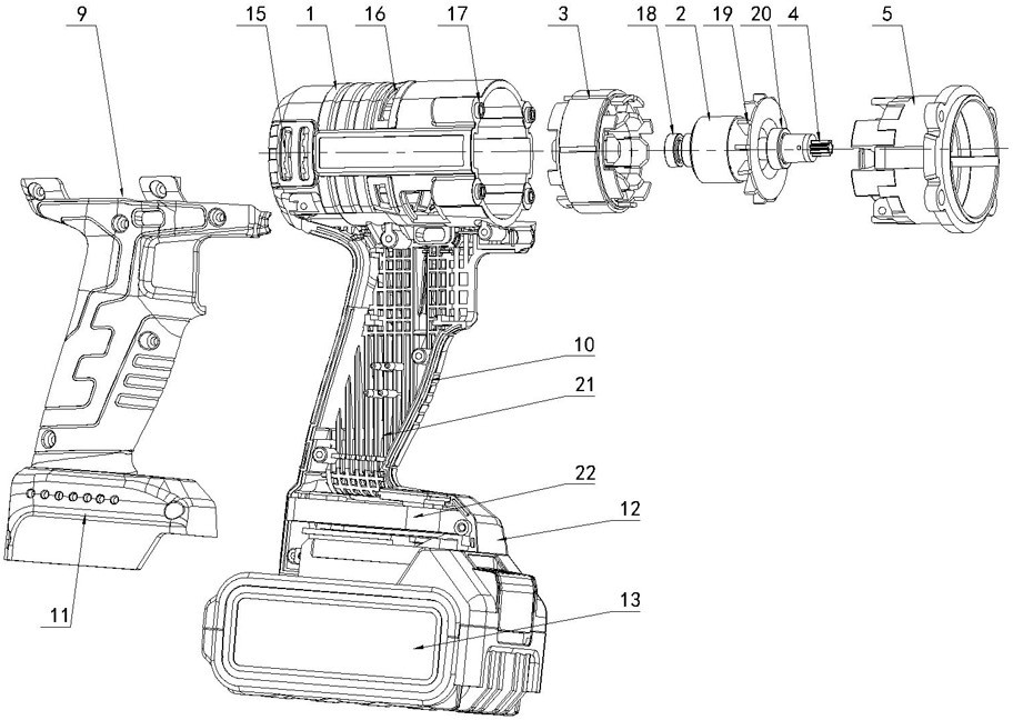本实用新型公开了一种无刷锂电电动扳手,包括机壳、无刷电机、中间盖、头壳、手柄、按钮开关、控制器、电池包,中间盖两端对应固定在机壳和头壳上,头壳与中间盖之间安装有行星减速冲击装置,所述的机壳采用圆筒形结构,机壳的后壁设有轴承座,轴承座上安装有后轴承,中间盖上固定有前轴承,无刷电机包括转子组件和定子组件,定子组件安装在机壳内,转子组件套设在定子组件上,转子组件的电机轴两端对应设置在前后轴承上,电机轴的输出端与行星减速冲击装置的行星齿轮啮合。采用上述结构后,具有结构简单合理、配合精度要求低、装配质量稳定、使用及携带方便、不受工作场所和电源限制等优点。