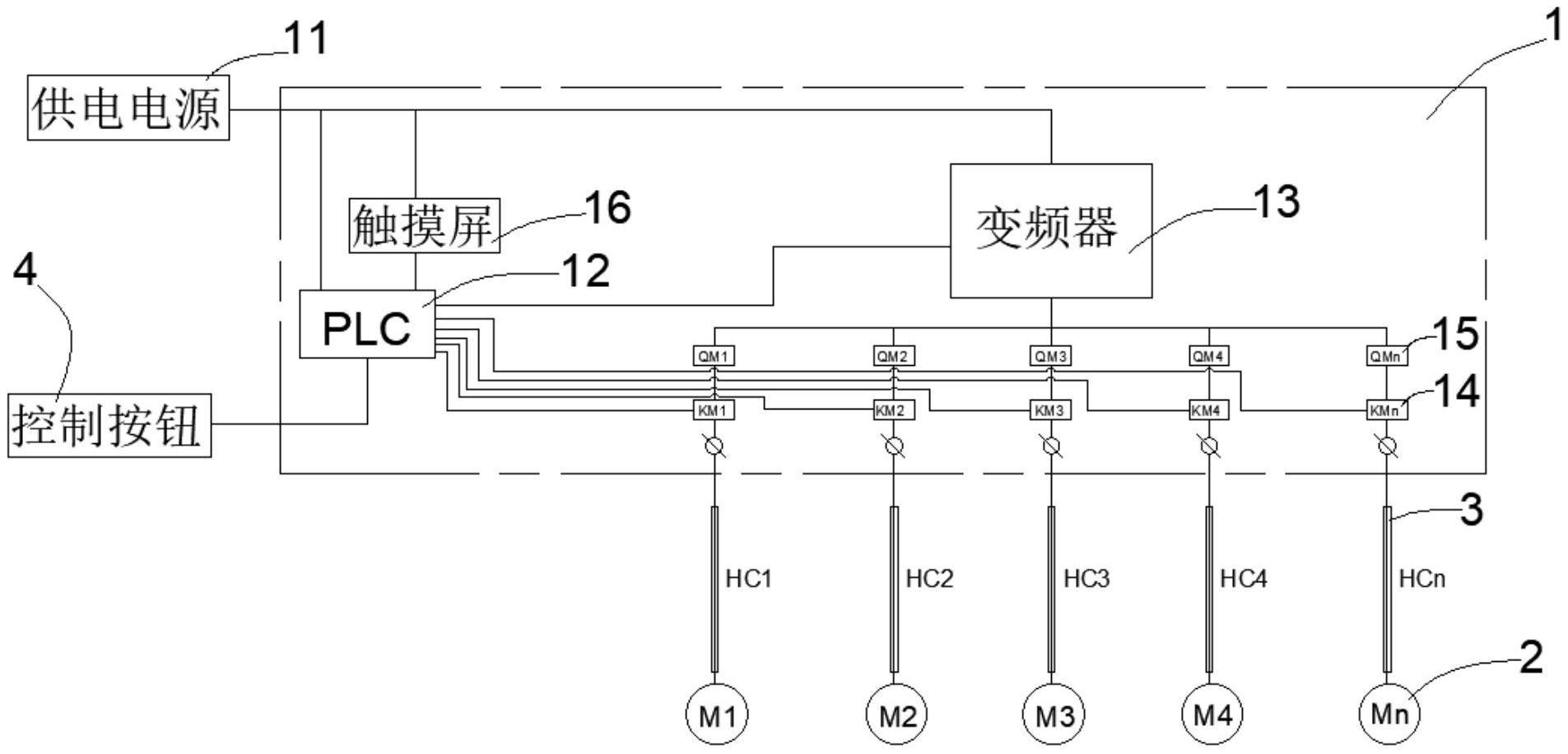 本实用新型属于推拉门控制技术领域,尤其涉及一种推拉门集中控制系统。包括供电电源、控制单元与多台电机,控制单元分别与多台电机电连接,控制单元包括PLC、变频器和多个接触器,PLC的输出端分别与变频器和多个接触器通信连接,PLC和变频器均与供电电源电连接,多个接触器均与变频器电连接,电机的数量与接触器的数量相等,每台电机与一个接触器电连接;PLC通过控制接触器的通断来控制电机的启动与停止;变频器用于改变电机转速。本实用新型的推拉门集中控制系统通过一台变频器对电源进行总的变频处理,实现各扇大门缓慢起步,通过PLC和一台变频器对多台推拉门电机进行控制,可以大幅节约大门的控制系统成本,便于安装维修,控制集成度高。