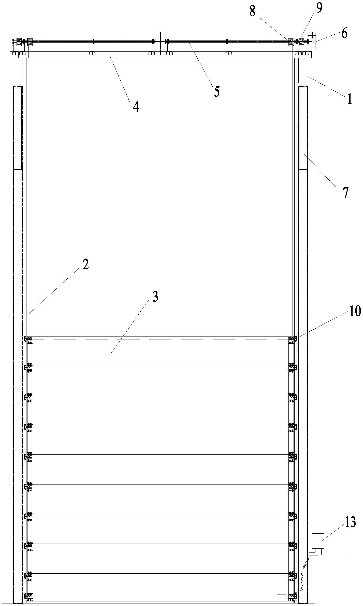 本实用新型属于电动滑升门设备技术领域,涉及一种滑升门,包括门框,门框顶部安装横梁,横梁上转动设置传动轴,传动轴由横梁顶部安装的开门机驱动;所述传动轴上安装门板绳轮、平衡锤绳轮,门板引出的钢丝绳与门板绳轮相连接,平衡锤引出的钢丝绳与平衡锤绳轮相连接,所述门板与平衡锤的重量相等,平衡锤绳轮与门板绳轮两者的钢丝绳绕线方向相反;门板与门框之间动密封配合,门板底部连接下密封条。该滑升门结构合理,开门机开门时只要克服门的惯性和摩擦力就能开启门板,不需要选用大功率的开门机就能实现可靠工作。