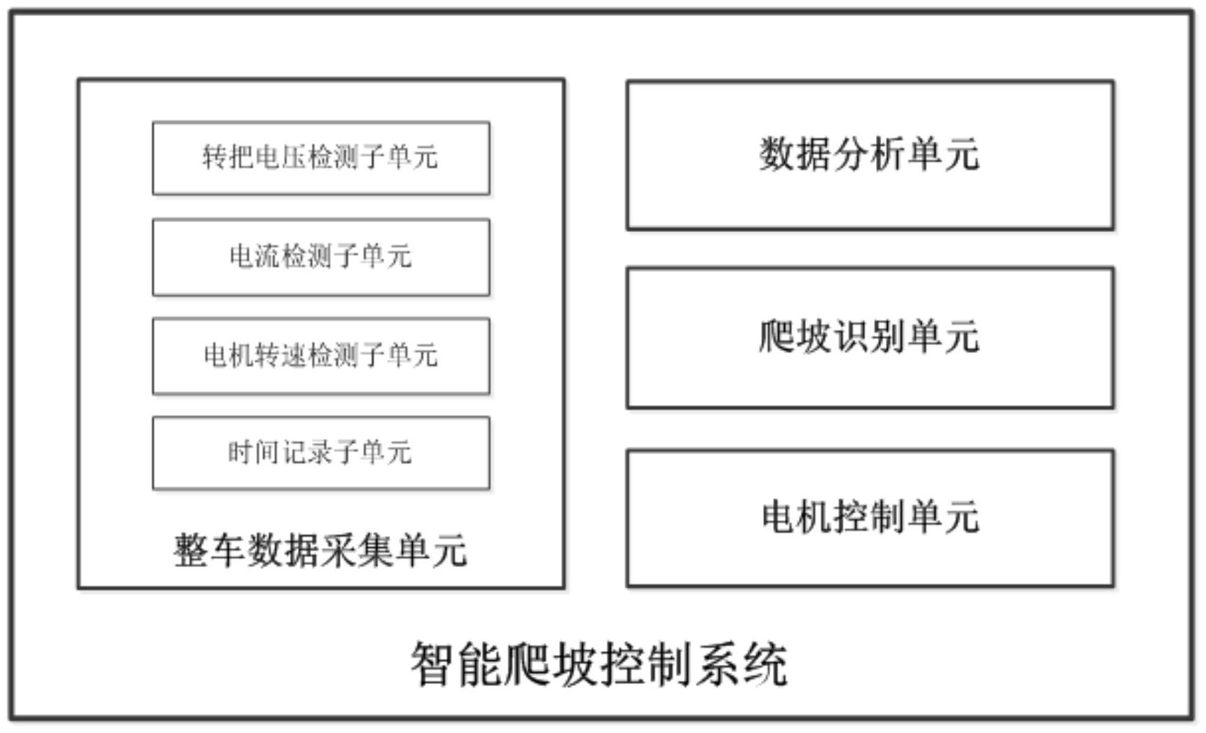 本发明涉及一种智能爬坡控制系统、电动车及其方法,其主要技术特点是:智能爬坡控制系统包括整车数据采集单元、数据分析单元、爬坡判定单元和电机控制单元;智能爬坡电动车安装有智能爬坡控制系统;爬坡控制方法包括:判断整车线电流是否达到初始限流值且转把电压大于有效最高值;当整车线电流达到初始限流值且转把电压大于有效最高值时,进入爬坡识别阶段;若爬坡扭矩不足,则进入预设定爬坡程序;当满足爬坡程序退出条件时,恢复初始程序。本发明能够智能识别爬坡路况,可以使电动车既可以在平路可靠行驶,又能够在爬坡时动力充足,有效提升了电动自行车的使用性能,更好的满足广大用户的需求。