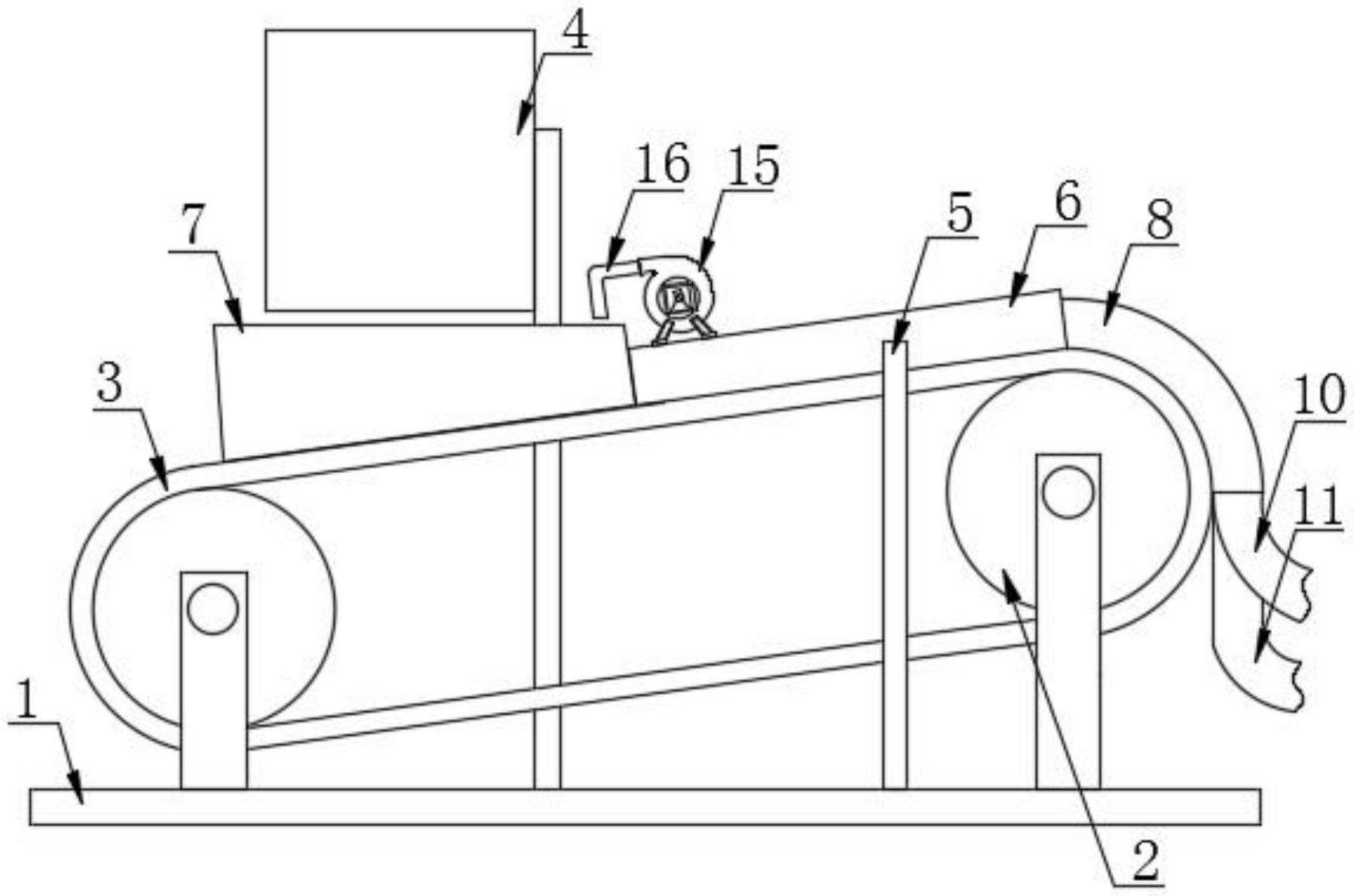 本实用新型公开了一种半球形塑壳快速吹扫整理装置,包括底座和两个转动架,底座顶部的两侧分别与两个转动架的底部固定连接,两个转动架的外表面传动连接有输送带,底座的顶部通过固定板固定连接有输送斗,底座的前部与后部均固定连接有支撑板,本实用新型涉及药品包装技术领域。该半球形塑壳快速吹扫整理装置,通过将半球形塑壳放进输送斗内,通过输送带对半球形塑壳进行输送,通过第一整理框和第二整理框进行分类整理,能够很好的使开口向上的半球形塑壳进入第二整理框内,开口向下的半球形塑壳进入到第一整理框内,能够有效的将开口方向不同的半球形塑壳进行整理,可以更好的节省时间精力,方便机器自动进行取壳、扣壳。