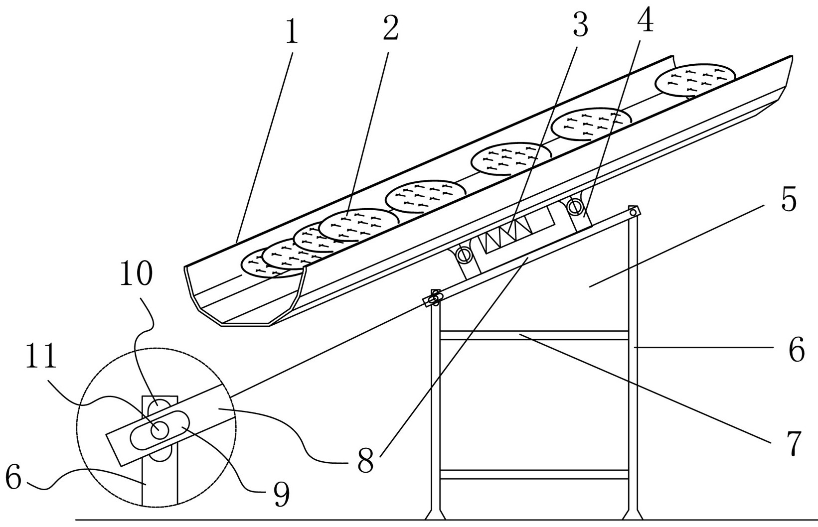 本实用新型涉及饼干生产装置,公开一种振动式竖饼整理装置,包括:倾斜状态的U型槽,该U型槽的内径大于饼干的直径,并使饼干以直径两端悬挂于U型槽内,U型槽还设置了使之振动的振动器。本实用新型构造简单,制造价格便宜,可解决了圆形饼干水平方向高速输送转换成竖直方向紧密叠起慢速输送导致的部分饼干被打散或打乱正反面,影响包装效果的问题,实现竖饼整理效果,从而使生产人员容易抓取饼干进行包装工作,大大提高生产效率。