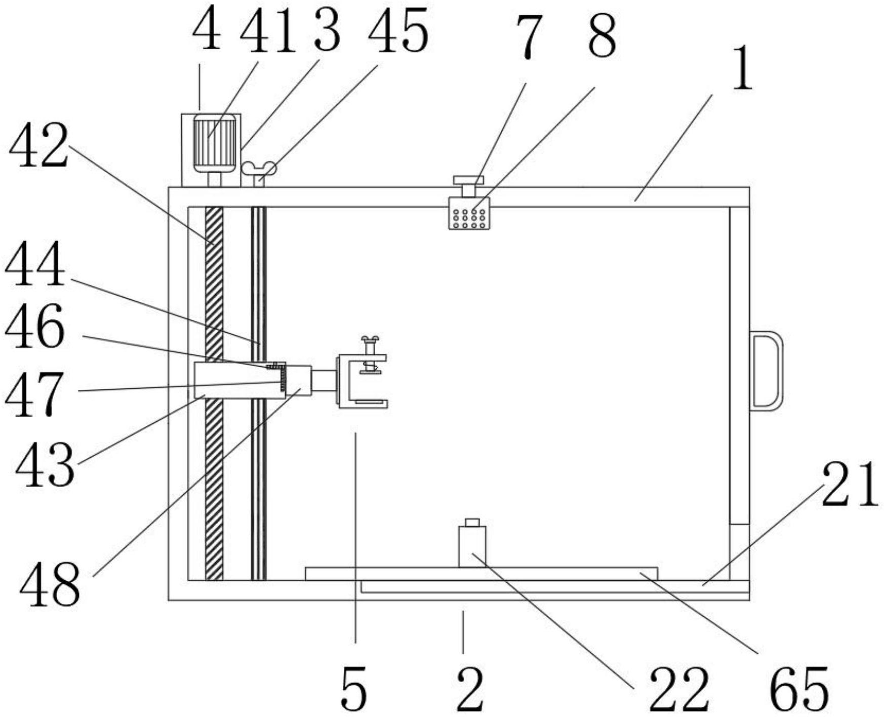 本实用新型公开了一种阻燃塑木复合材料制备用检测装置,包括主体箱,主体箱的内壁底端设有喷火机构,主体箱的外壁顶端一侧固定连接有电机架,主体箱的内壁一侧设有定位机构,定位机构位于电机架的正下方,定位机构上设有夹持机构,主体箱的内壁顶端中央固定连接有喷淋头,喷淋头上方设有进水口,该阻燃塑木复合材料制备用检测装置,通过定单位机构,在减速电机的作用下,可使检测材料上升或者下降,操作简单,使用耐火检测更为安全,通过计时器、温度传感器、显示屏可以精确测量燃烧和熄灭时间和燃烧温度,精确度更高,通过观察窗观察有没有任何的掉落物,也就是说它燃烧时不会产生任何的新的火源。