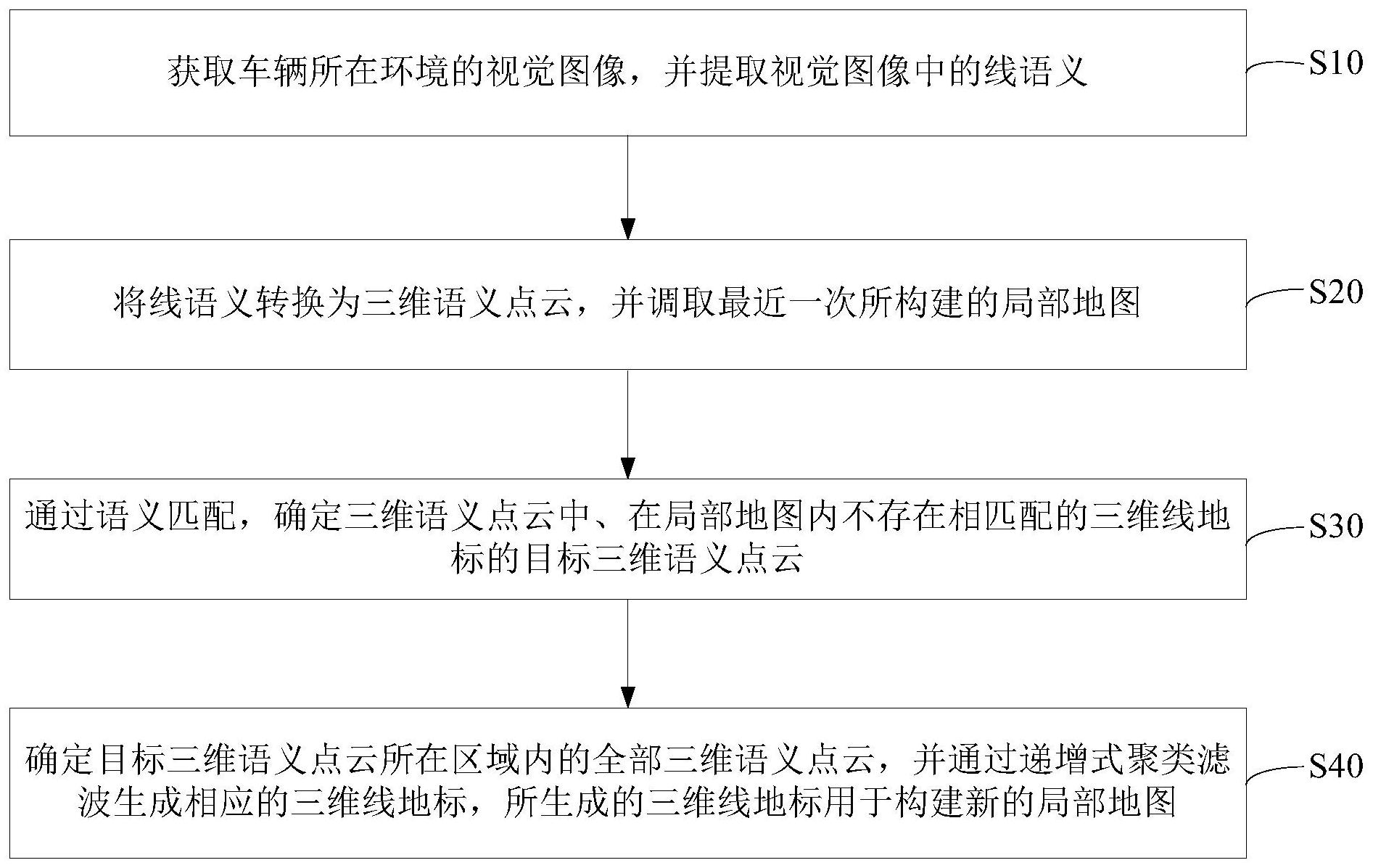 本发明提供的三维线地标构建方法及装置,通过将视觉图像中线语义转换为三维语义点云,与最近一次所构建的局部地图进行语义匹配,以确定在局部地图中不存在相匹配的三维线地标的目标三维语义点云,进而通过递增式聚类滤波生成相应的三维线地标,由此构建新的局部地图。本发明能够准确构建三维线地标,提高三维语义地图的精度,并且,在无语义的场景下,能够将可通行空间边界线建入地图中。