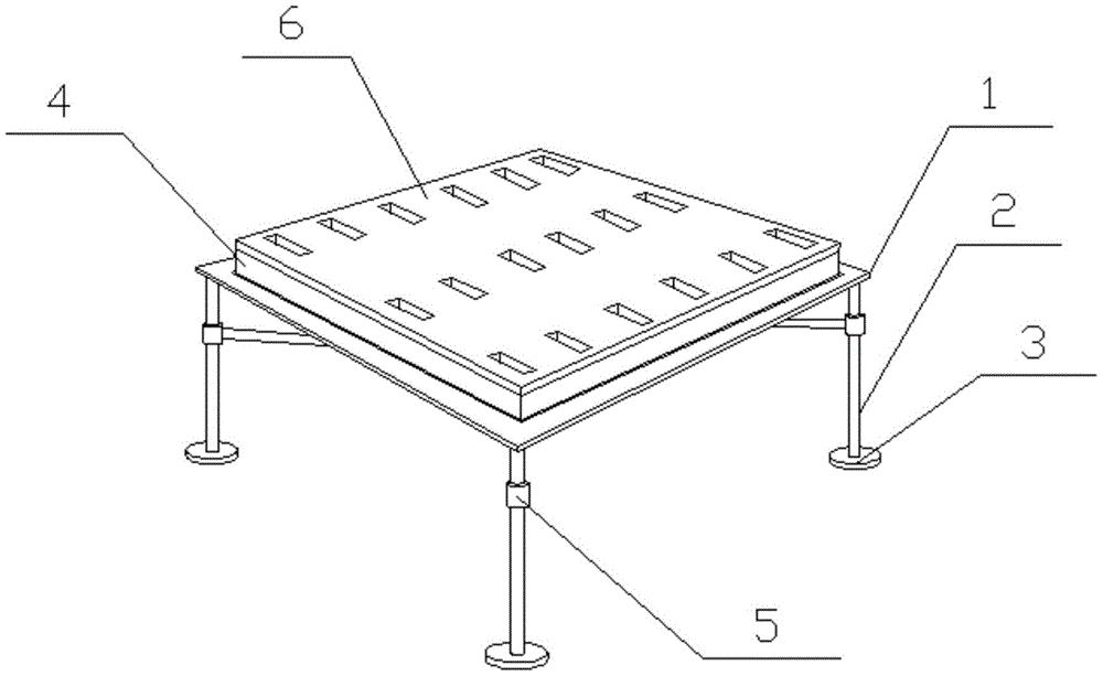 本实用新型公开了一种格栅型防静电通风地板,其结构包括支撑架、支撑腿、支撑座、地板、固定装置和保护垫,本实用新型的一种格栅型防静电通风地板,通过设置了固定装置,固定板向上移动给予地板支撑力,支撑杆和固定环起到固定作用,再通过旋钮旋紧进行固定,解决了现有技术通风地板使用时不够稳定,中部容易塌陷的问题,通过设置了保护垫,橡胶层起到防滑作用,PVC层和尼龙层起到防静电作用,石棉板起到防火作用,防水板起到防水作用,解决了现有技术通风地板易滑到,并且防静、防火和防水电功能不完善的问题。