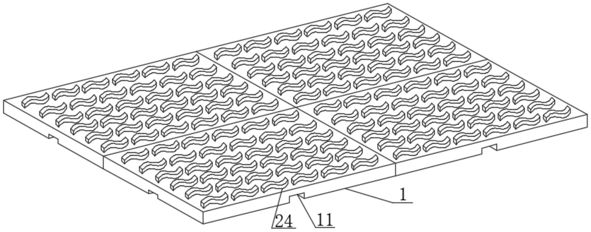 本实用新型公开了表面防滑的PVC防静电地板,包括板材本体,板材本体由基层、抗压层、印花层、耐久层以及防滑层,基层上粘接有抗压层,抗压层上压印有印花层,印花层上涂覆有耐久层,耐久层上粘接有防滑层,基层上设置有T型槽,相邻基层之间的T型槽通过工字型块卡入衔接。通过聚乙烯材料制成的耐久层,配合玻璃纤维层能够保证地板使用强度的同时,提高地板的耐久性,并且波纹凸起可起到一个防滑效果。