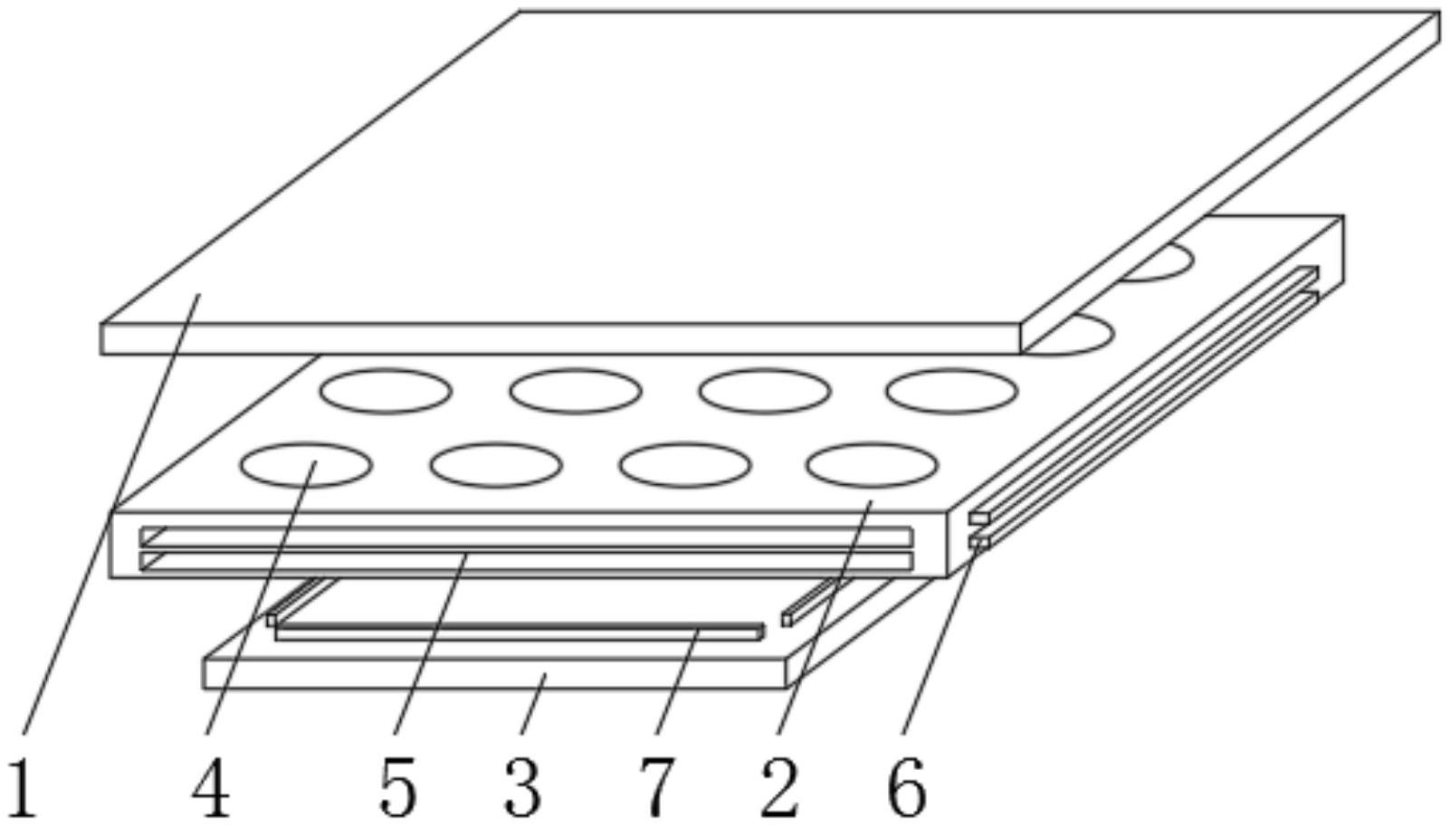 本实用新型涉及地板技术领域,具体是一种钢基空腹网络地板,所述盖板的下方安装有承载板,所述承载板的上表面开设有凹槽,且承载板的两侧分别设置有槽口和卡板,所述承载板的下表面均匀开设有卡槽,且承载板的下方还安装有支撑架,所述支撑架的上表面固定安装有与卡槽适配的卡块,且支撑架的下方等间距均匀安装有升降件。本实用新型结构简单、设计新颖,通过凹槽既降低了原料的成本,同时增加承载板的承载力,从而提高地板的稳定性,通过槽口与卡板卡合,使得相邻的两个地板间的连接更加简单、紧密,提高整个网络地板的稳定性,且使地板安装后更加美观,通过升降件调节地板安装时所需的高度,以适应不同的客户需求。
