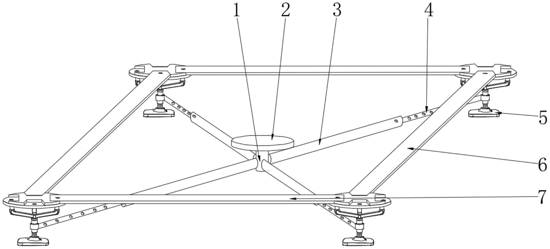 本实用新型涉及活动地板技术领域,公开了一种活动地板可调式支架,为了提高活动地板支架的灵活组装使用性,所述支撑立柱的顶端固定有中心支撑盘,所述伸缩支杆通过定位卡套与升降调节支座套接固定,所述升降调节支座的上方位于两侧位置处对称卡合有纵向安装板,且升降调节支座的上方位于前后两侧位置处对称卡合有横向安装板。本实用新型通过支撑主杆与伸缩支杆的配套组合,在升降调节支座的升降调节下,能够对升降调节支座的支撑大小进行精准、灵活调节,且在调节使用过程中,通过纵向安装板、横向安装板对升降调节支座的卡合定位,在支撑主杆与伸缩支杆对升降调节支座的再次套接固定下,能够提高地板支架的支撑稳定性。